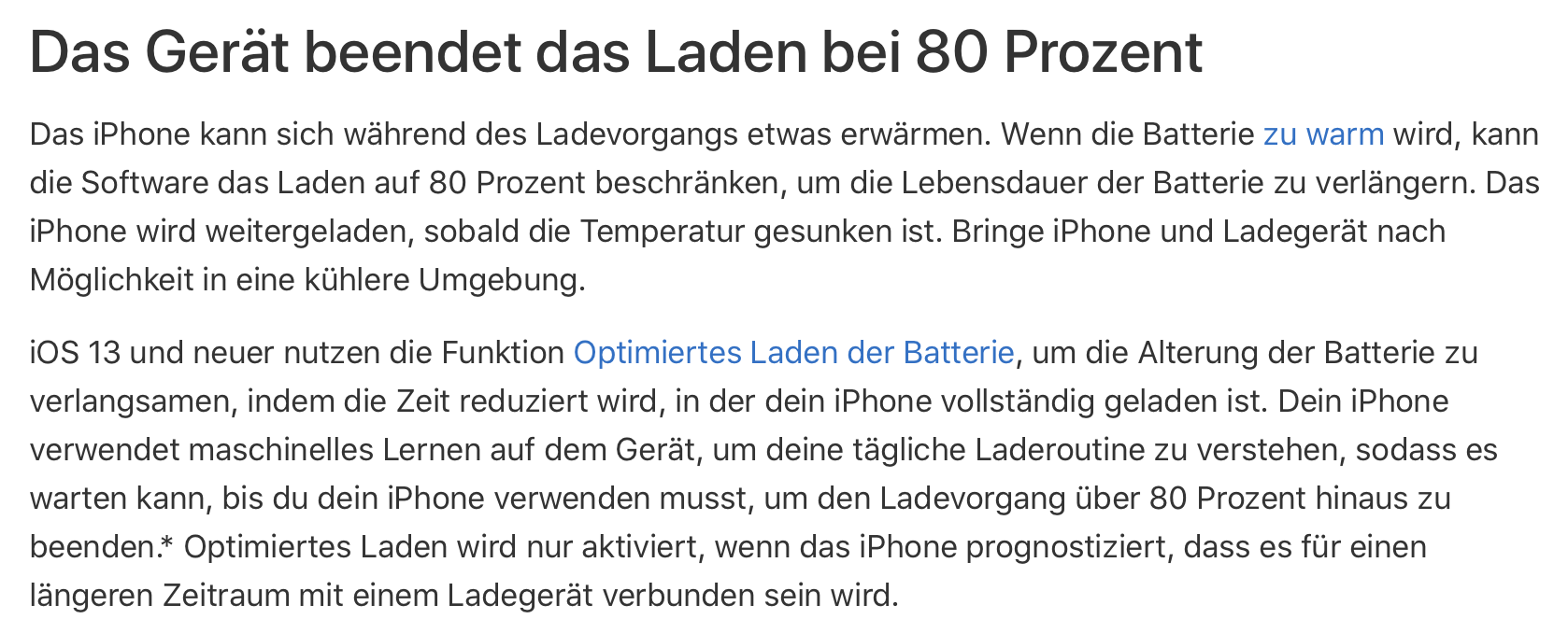 Ich hab seit längeren eine Problem mit meinem Handy, da es sich nur bis 80% lädt mit dem 20W Adapter von Apple. Und mit dem 10W Adapter von Apple lädt es bis 100% auf, hab auch optimiertes laden an und aus gemacht und da hat sich auch nichts derartiges geändert lädt immer noch bis 80%. Und ab und zu lädt das Handy mit dem 20W Adapter Garnichts muss es mehrmals rein und raus stecken.