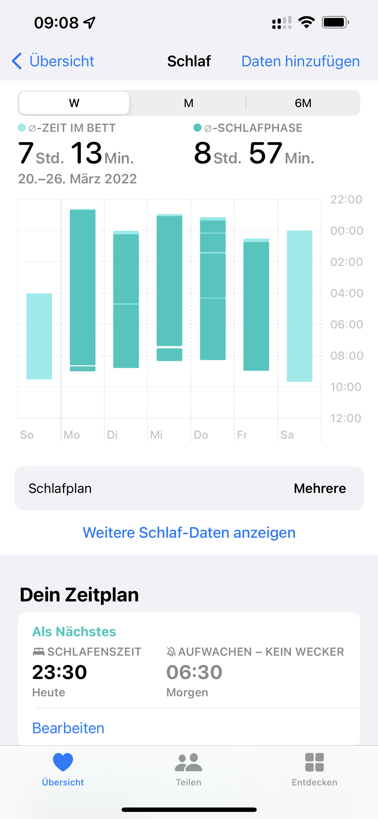 da ich grundsätzlich eine sehr niedrige Differenz zwischen Nacht und tag Herzfrequenz habe hat die Apple Watch bei mir zum Teil 2-3 Stunden zu viel Schlaf angezeigt. Die Bettzeiten waren meistens ok.