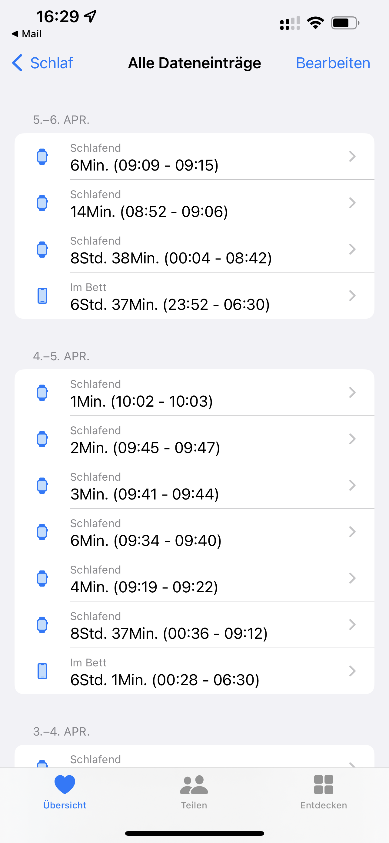 da ich grundsätzlich eine sehr niedrige Differenz zwischen Nacht und tag Herzfrequenz habe hat die Apple Watch bei mir zum Teil 2-3 Stunden zu viel Schlaf angezeigt. Die Bettzeiten waren meistens ok.
