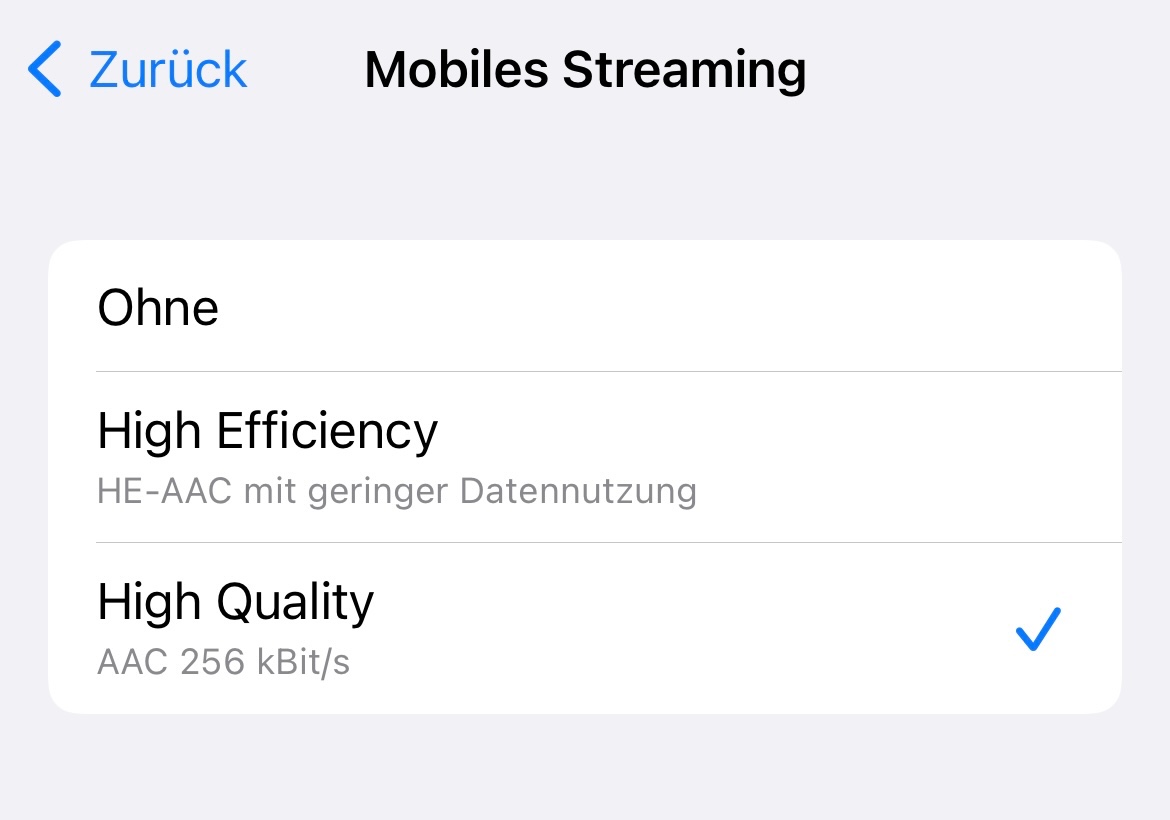 Prüfe bitte einmal in den Einstellungen > Musik > Audioqualität > Mobiles Streaming, welche Einstellung du da vorgenommen hast: