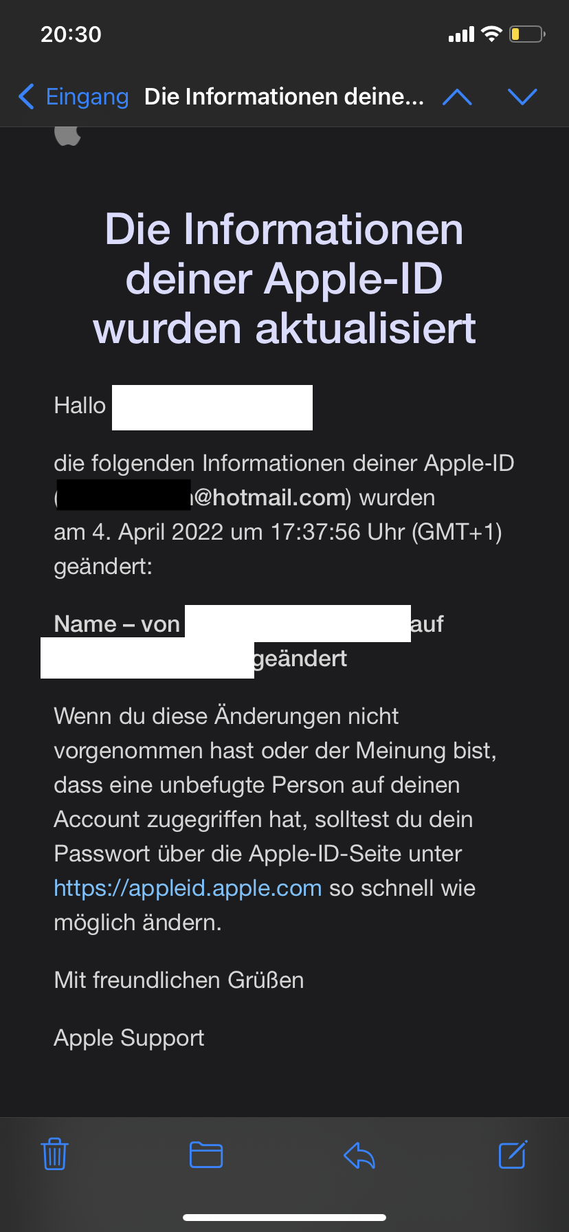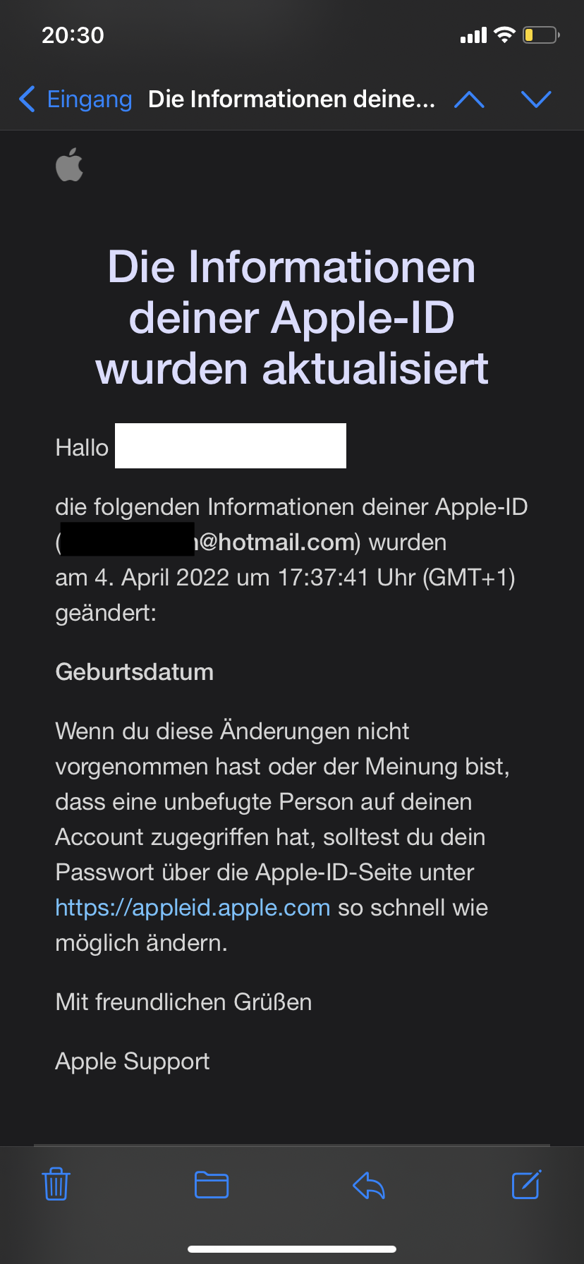 Ich habe heute eine Info bekommen, dass meine Apple ID in Zürich verwendet wird. Der Name und das Geburtstagsdatum wurde geändert. Ich habe das Psswort sofort geändert. Was muss ich tun?