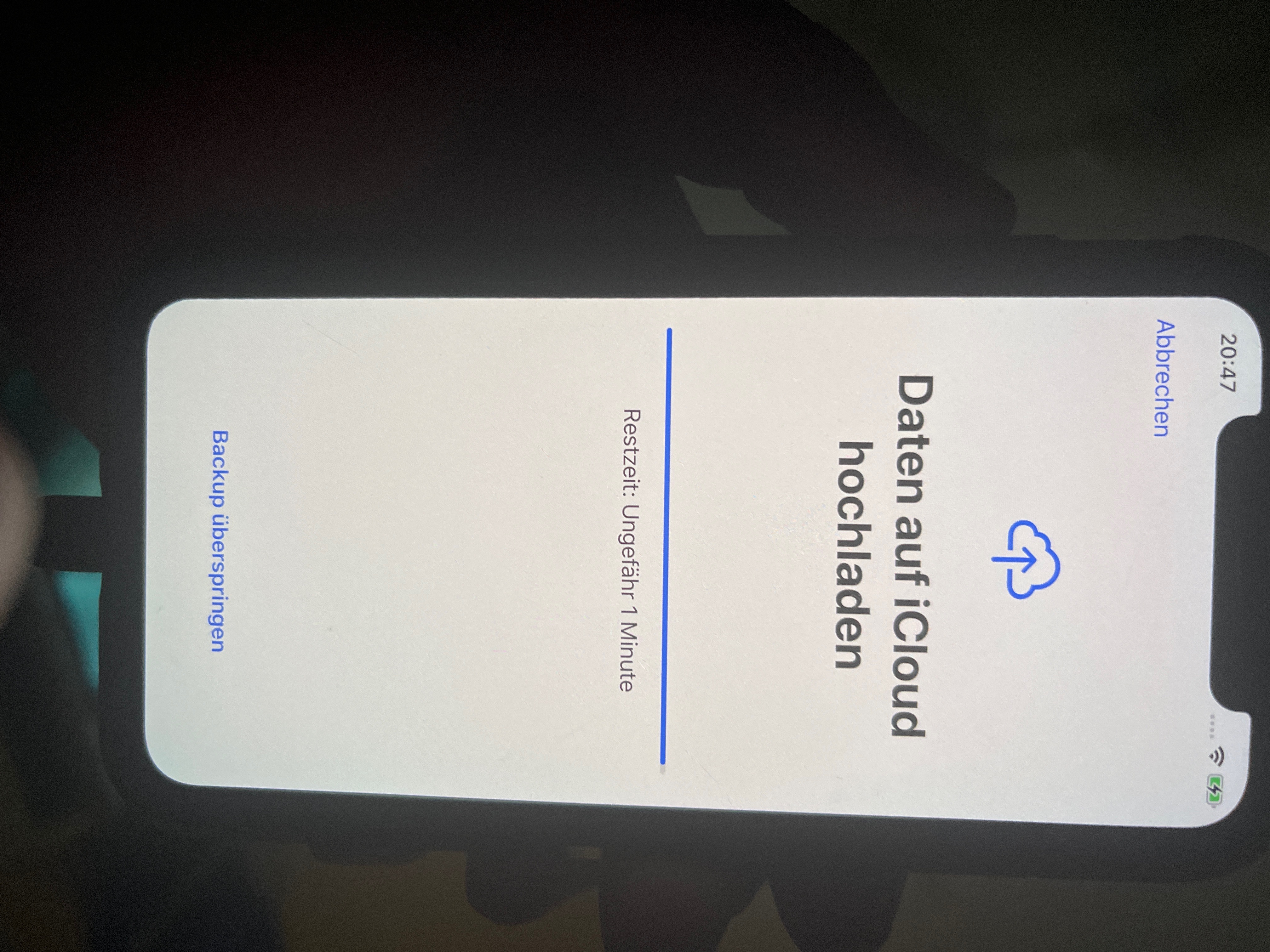 Hallo, ich möchte mein IPhone X auf Werkseinstellungen zurücksetzen. Leider hängt es nun mehr als zwei Sunden beim Daten auf iCloud hochladen und das bei der letzten Minute.