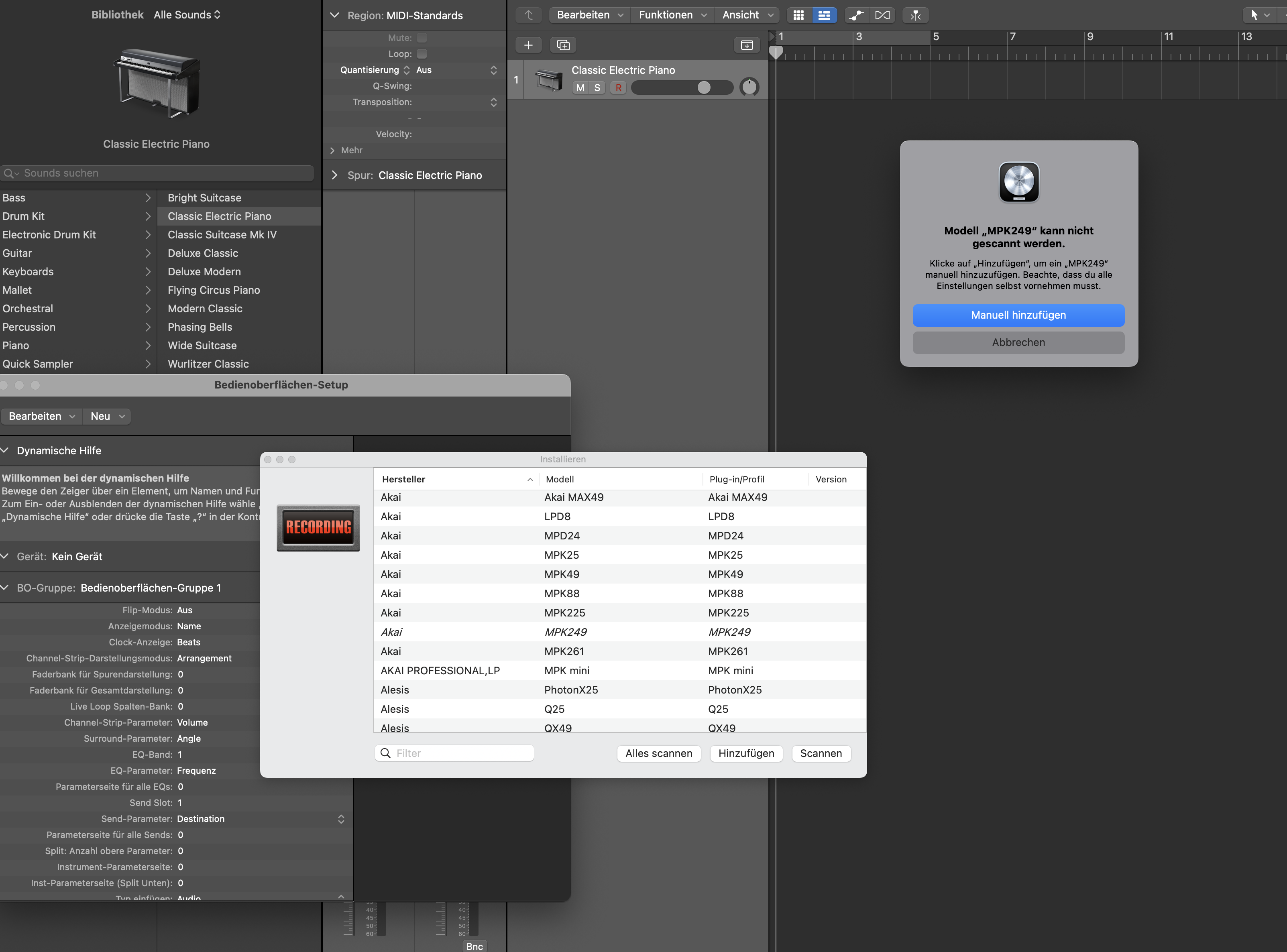 leider gelingt es mir nicht, mein Akai MPK249 als Bedienoberfläche/ control Surface in Logic Pro einzubinden...