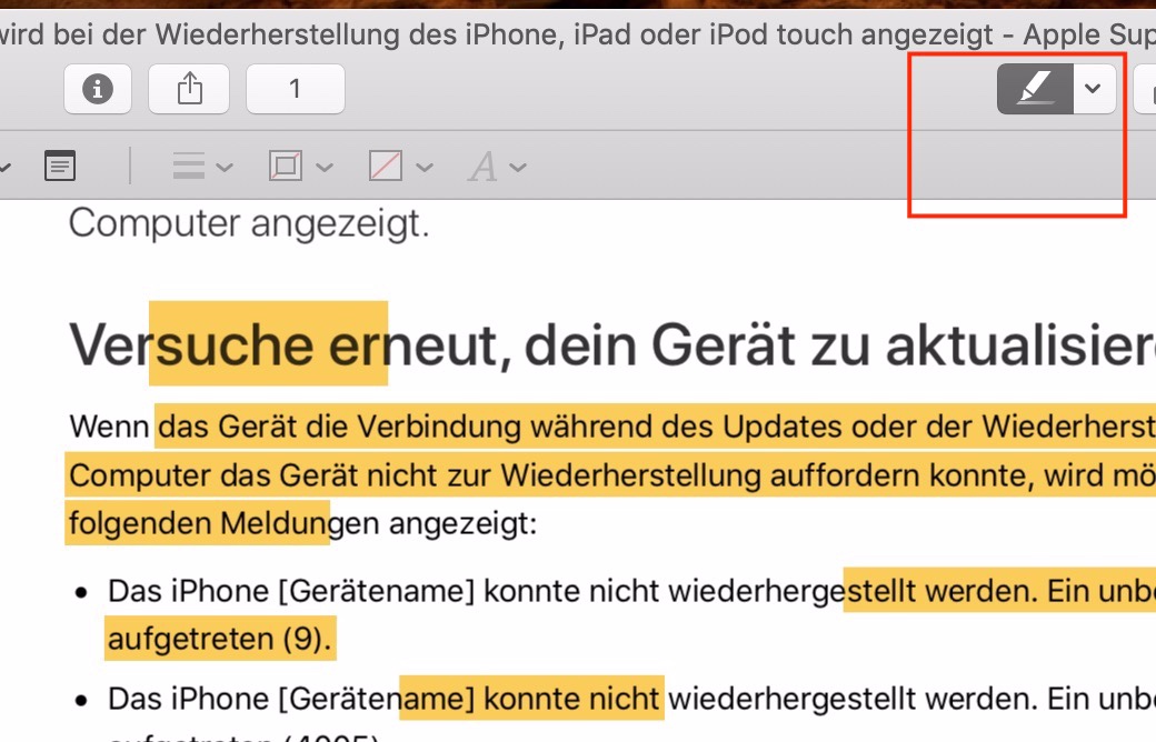 Hey, habe vorhin auf dem iMac in der Vorschau App auf einer pdf Datei etwas gelb markiert, wollte nun weiter markieren doch es geht nicht mehr. Ich kann den Text nicht mehr markieren oder sogar auswählen, probiere hoffnungslos seit einer halben Stunde. Datei geschlossen und wieder aufgemacht, andere Datei aufgemacht. Es geht plötzlich nicht mehr. Woran kann das liegen? Kann mir vorstellen dass ich irgendwo aus Versehen gedruckt habe und jetzt keine Ahnung habe wo 😅😅