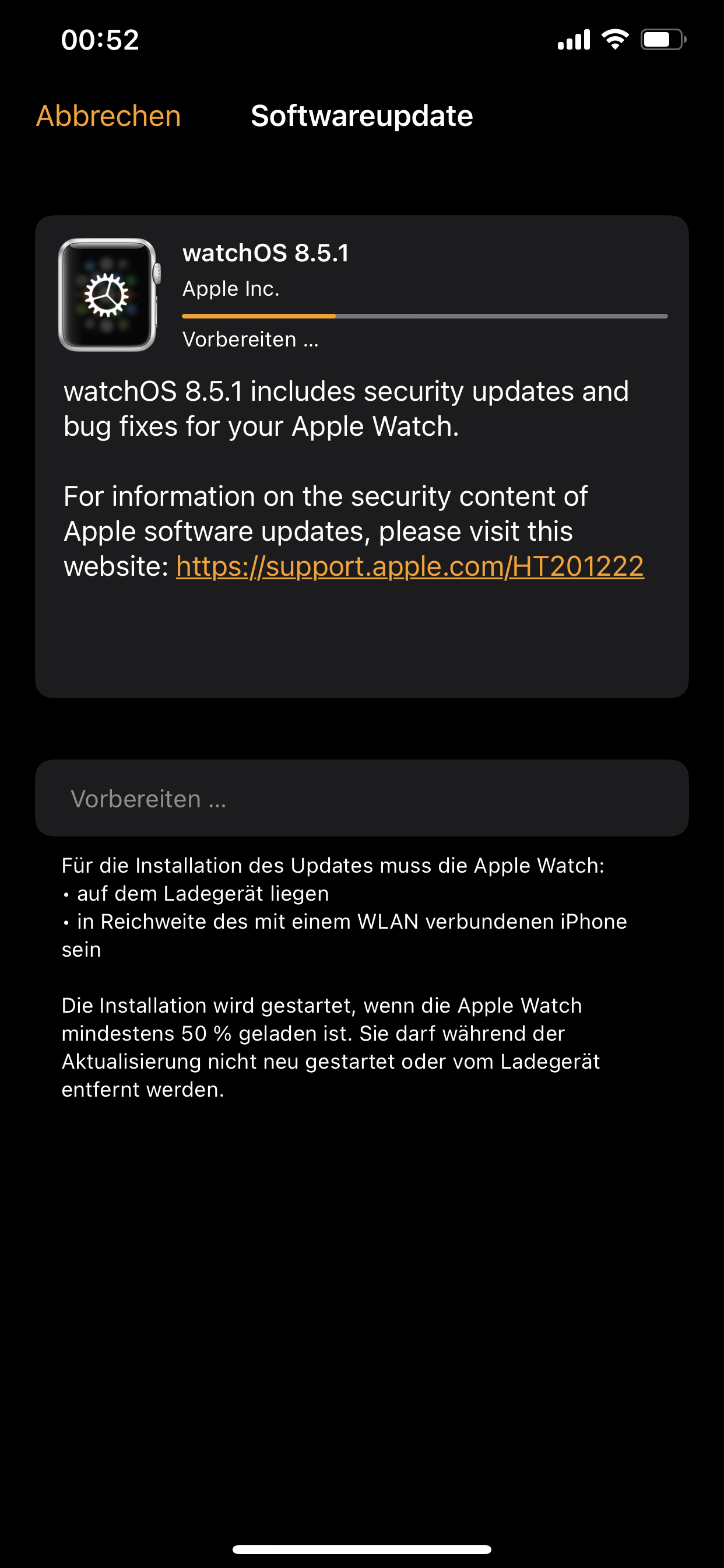 Ich habe eine neue Apple Watch und muss sie updaten überm Handy und wenn dieses Update fertig ist steht das vorbereiten und ladet die ganze Zeit. Im Screen shoot sieht man das es nicht weiter geht bitte hilf mir
