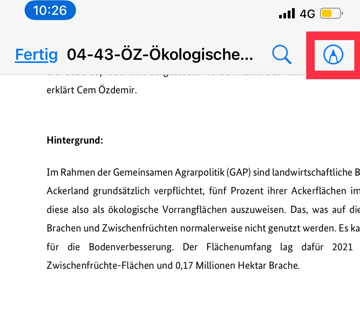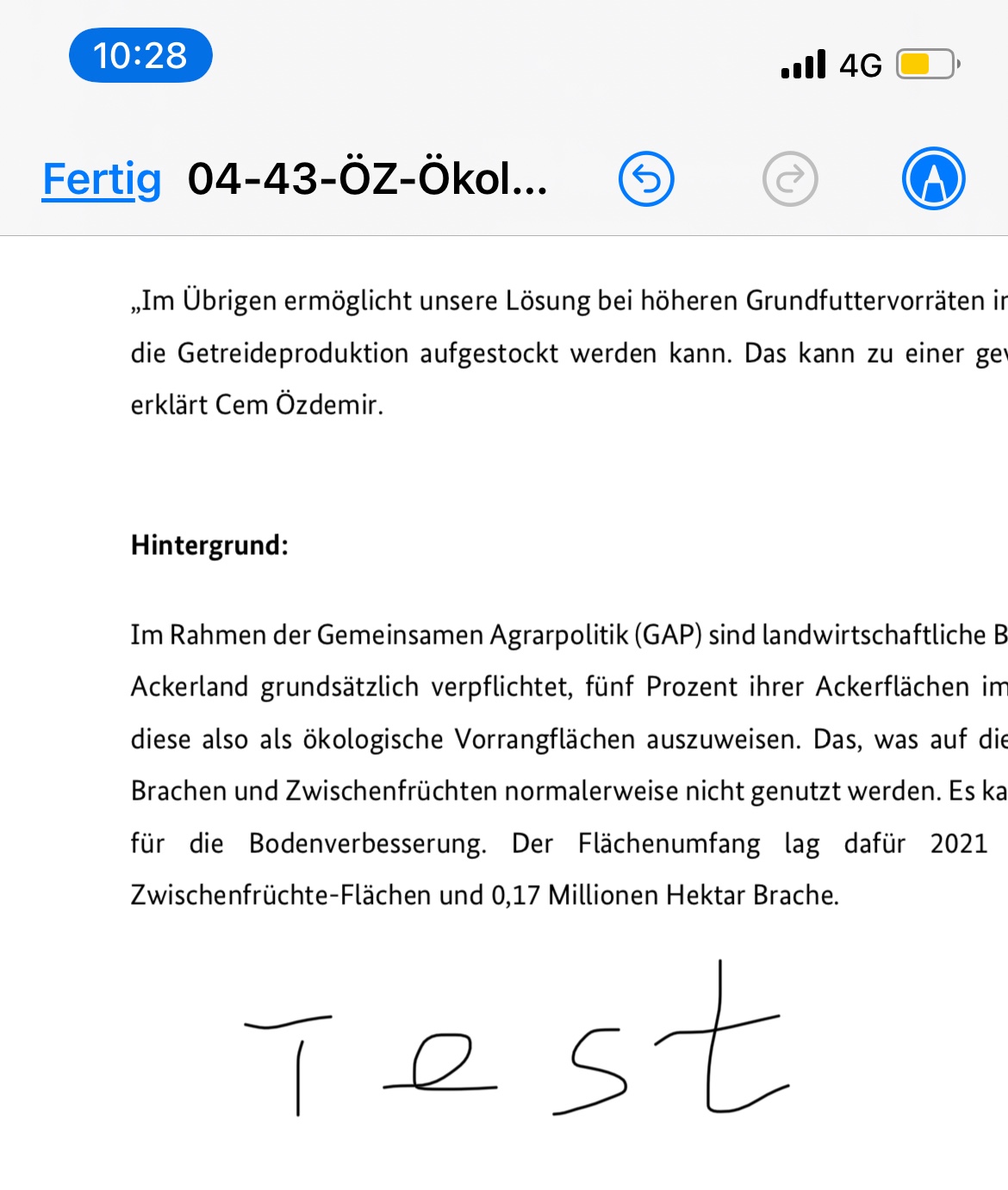 vielen Dank für deine Rückmeldung. Auf meinem iPhone wurde mir in dem PDF-Dokument auch keine dedizierte Unterschriftsfläche angeboten. Ich habe den Text direkt in eine freie Fläche des Dokuments geschrieben. Das funktioniert bei dir nicht?