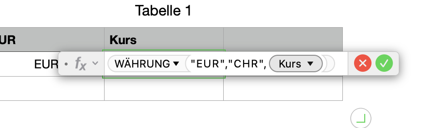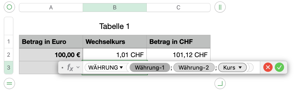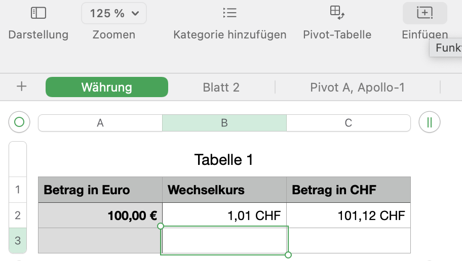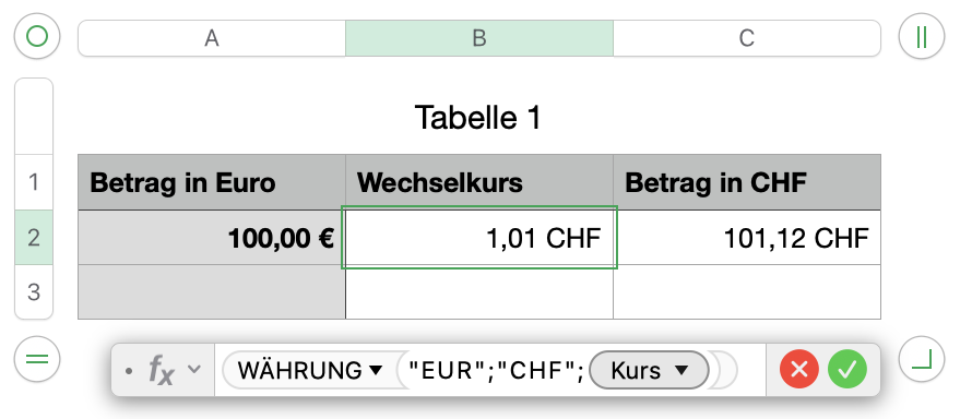 Spalte hat die Formel für den Wechselkurs und in Spalte C wird der Betrag in CHF ausgerechnet (A2 * B2).
