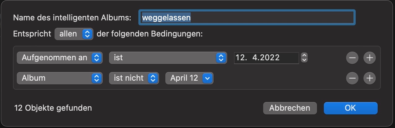 Um die weggelassenen Fotos zu identifizieren, habe ich ein neue intelligentes Album angelegt (Ablage > Neues intelligentes Album) und die Regeln so gesetzt: