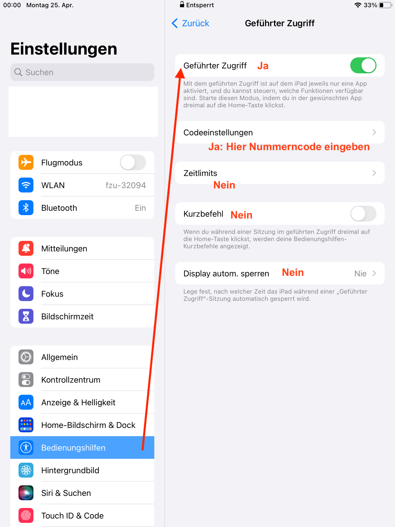 Beim Einstellen des Geführten Zugriffes muss man unbedingt einen Zugriff-Code aktivieren, sonst funktioniert es nicht.