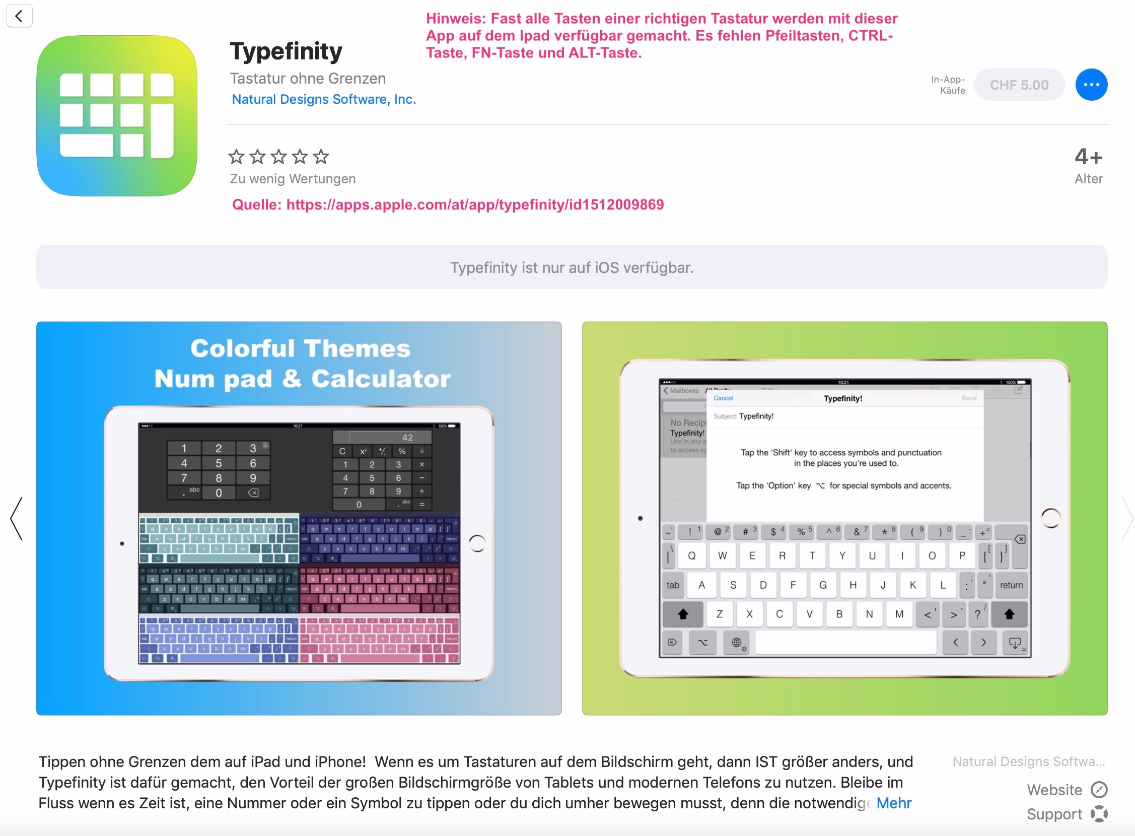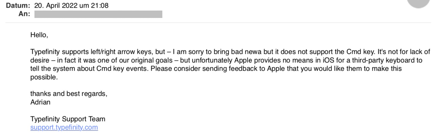 Die App heisst "Typfinity" (und hiess früher einmal anders) und kann im Appstore herunter geladen werden. Die "Home-Taste" und die "End-Taste" können ebenfalls nicht auf der Bildschirmtastatur eingesetzt werden.