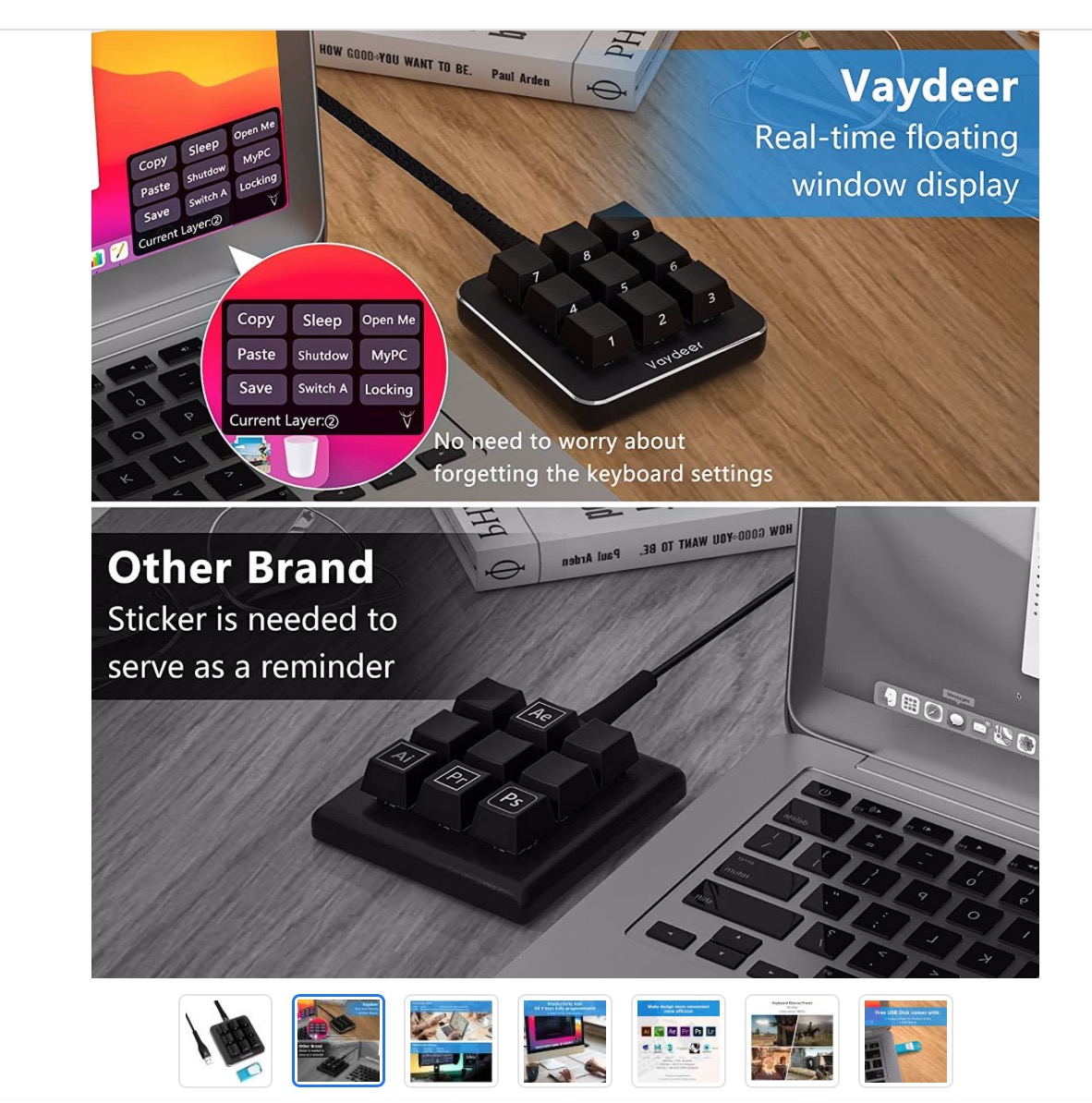 Die Tastatur wird gleichzeitig auf dem Mac abgebildet und das Konfigurieren der Tastatur erfolgt ebenfalls mit einer Software, die sich auf einem USB-Stick befindet, der mit der Tastatur mitgeliefert wird. Die Tasten selber können mit P-Touch-Bändern beschriftet werden oder man lässt sich die Tasten von einem Kollegen (der ein Lasergeschäft besitzt), lasern.