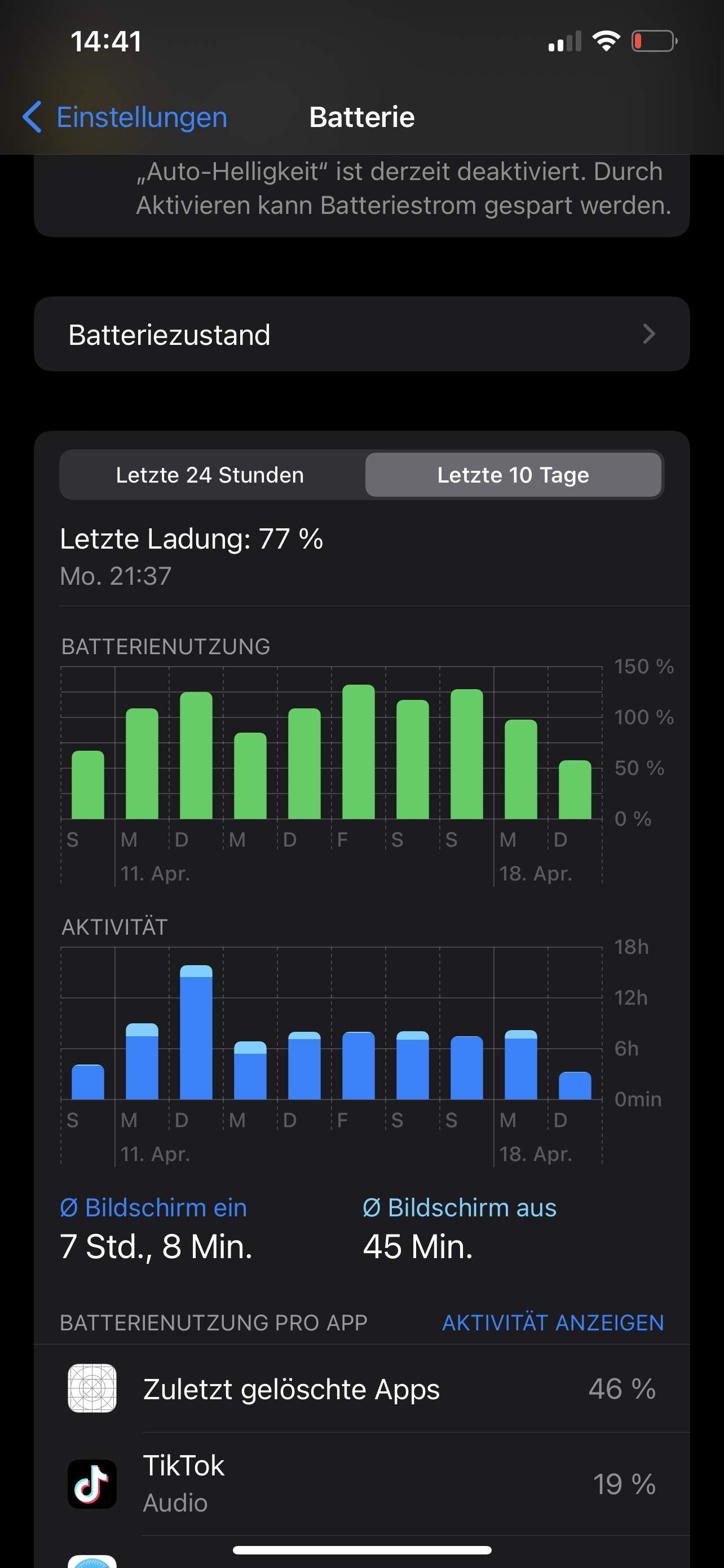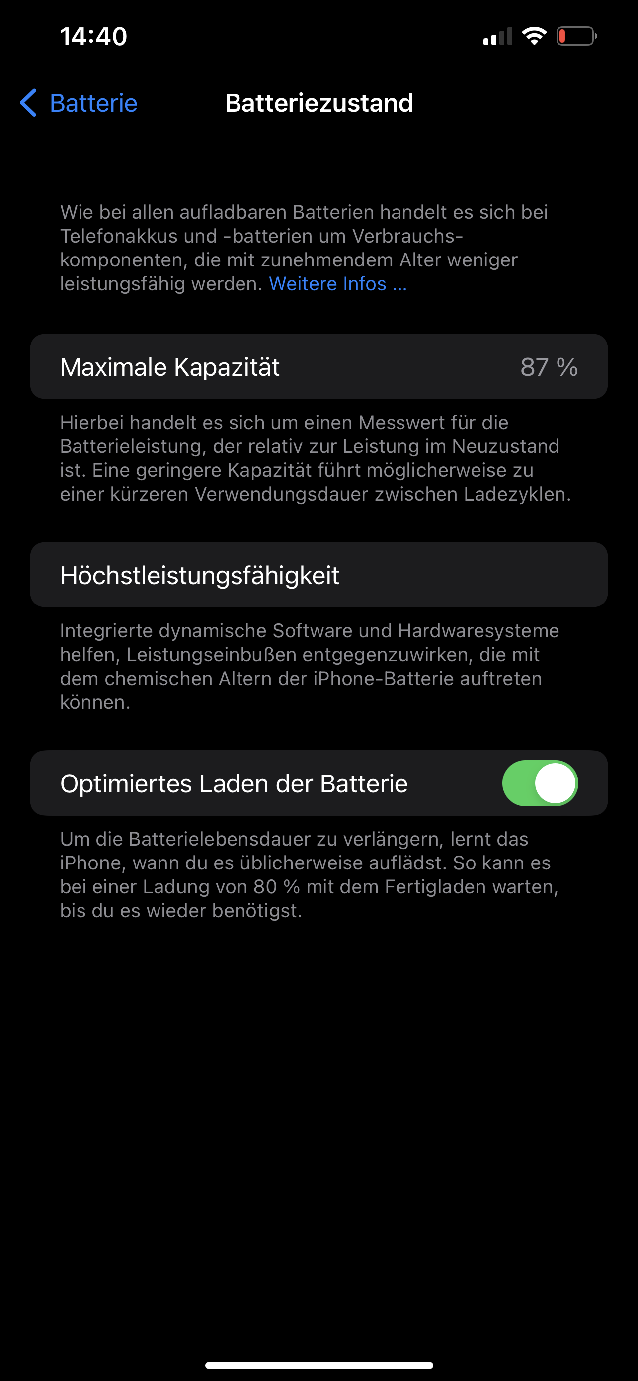 In letzter Zeit bleibt mein Bildschirm öfters hängen wenn ich auf der Startseite bin. Also beim hin und her wischen. Zudem merkt man dass es generell indem Moment langsamer wird. Ich habe von den 128GB Systemspeicher gerade mal knapp 50GB ausgenutzt. Der Akku ist auch noch bei 87%, also Höchstleistungsfähigkeit. Meine iOS Version ist die 15.4.1.