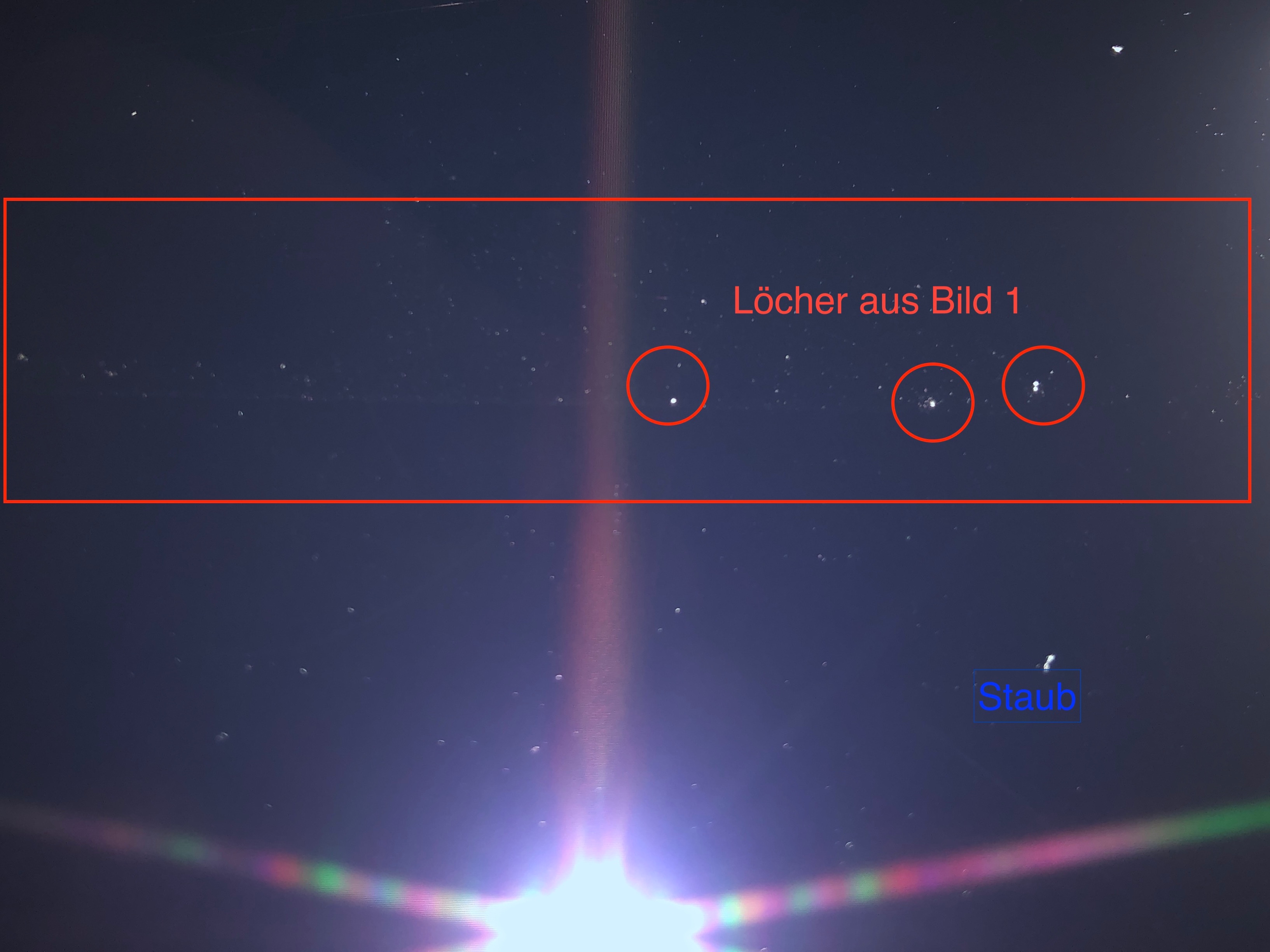 Du meinst nicht, dass ich das besser beurteilen kann? Es sind definitiv Löcher/Kratzer! Sie sind irreparable im Coating des Displays und verlaufen mehr oder weniger in einer Reiher über das Display, von schwächer bis stark ausgeprägt (wie im Bild).