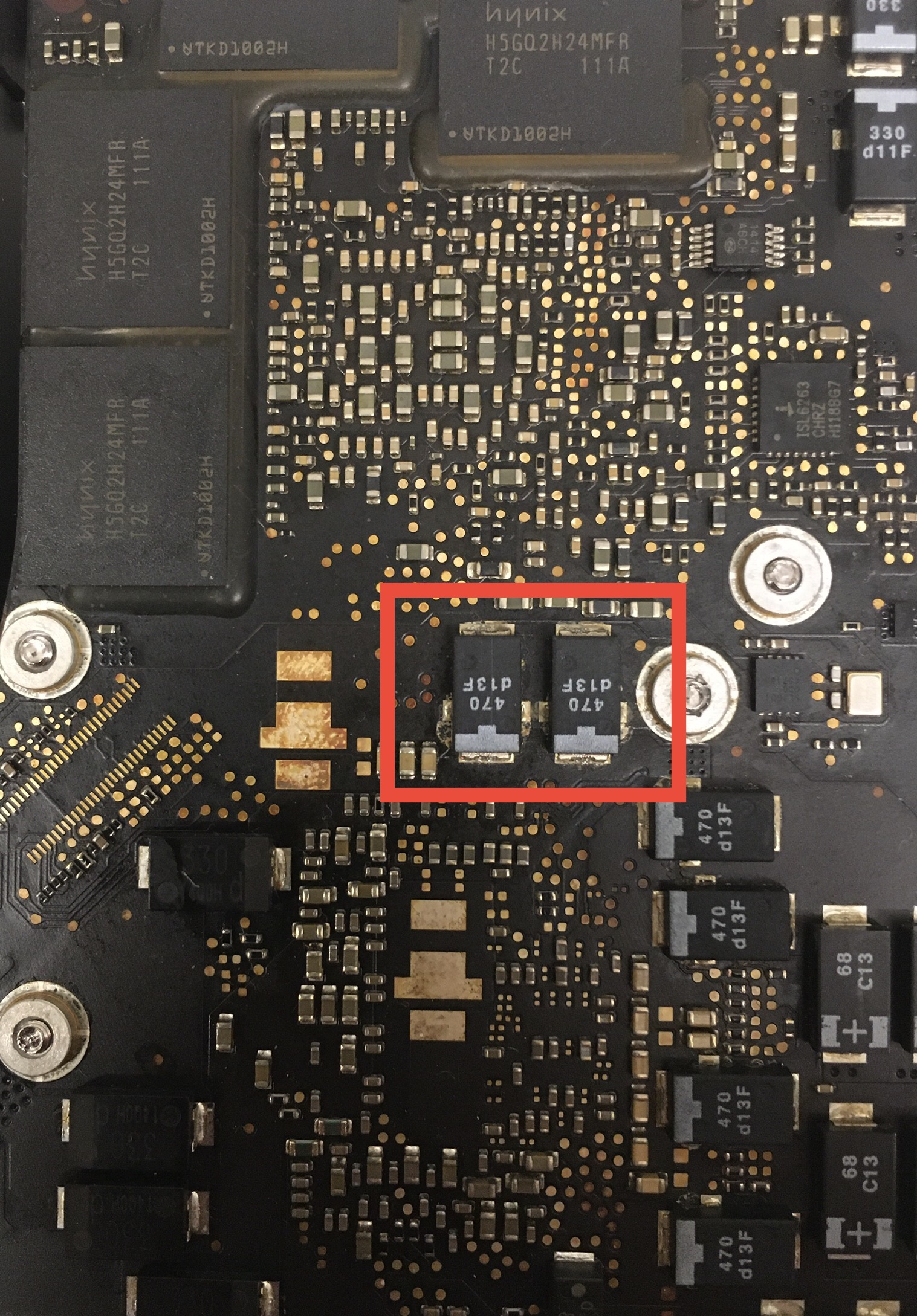 Habe mit dem Vergleichsmessungen der Spannung mit einem Guten MacBook gemacht. Dabei habe ich bemerkt, dass an den beiden Kondensatoren keine Spannung anliegt. Leider habe ich keinen Lageplan für die Bauteile und kann diese nicht benennen (Foto / Aufgenommen zwischen den Lüftern / unterhalb des Grafikchip)