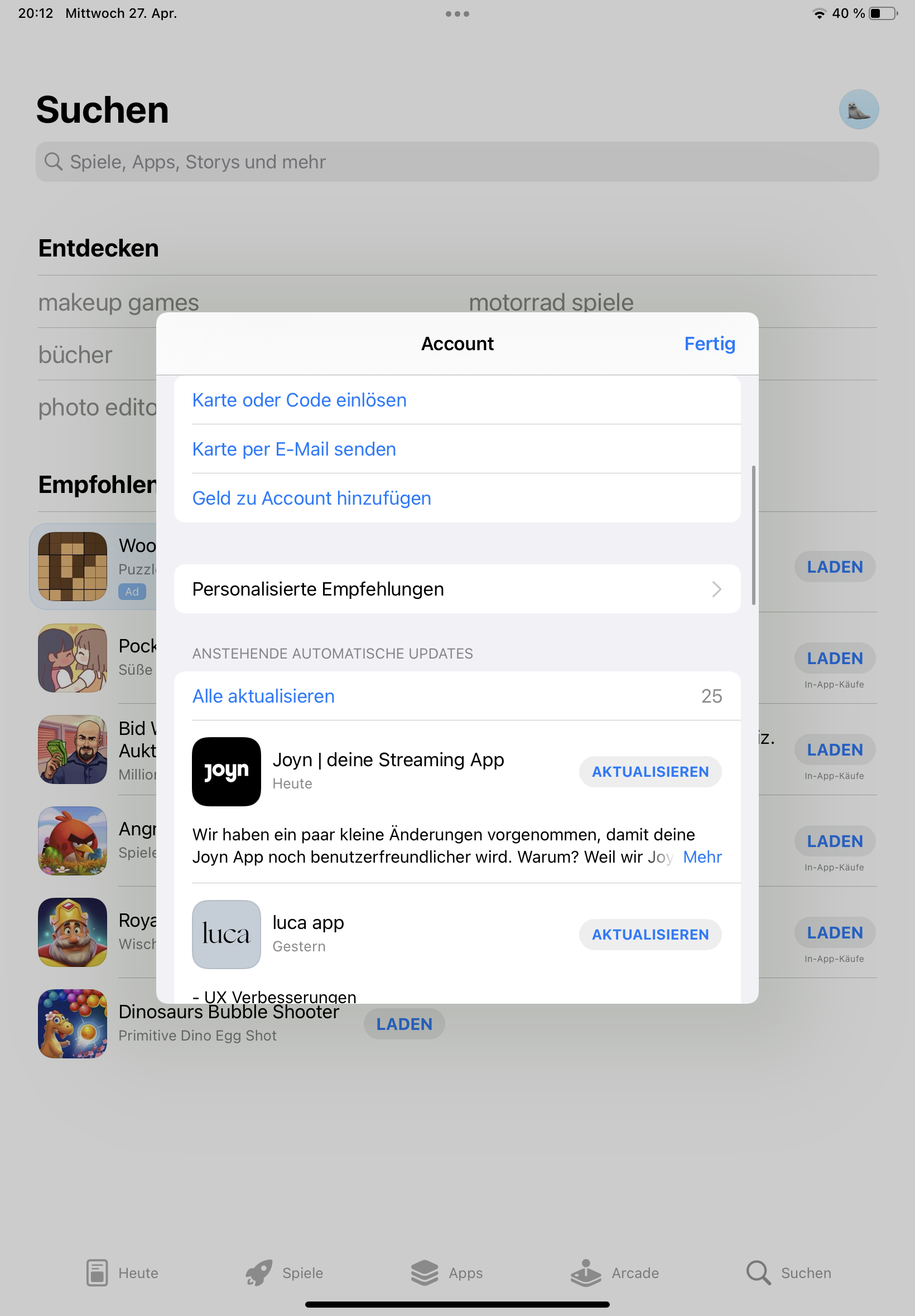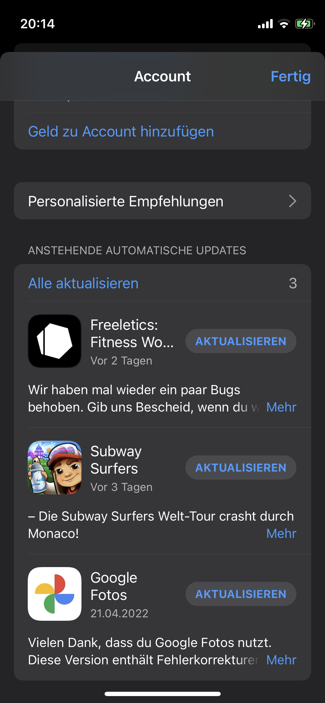 Hallo, ich habe folgendes Problem auf ALLEN Geräten von mir iPad Air (2020), iPhone 12 mini (2021), MacBook Pro (2021). Unter den Einstellungen ist automatisches Laden von Updates im Appstore aktiviert, aber keine App wird automatisch upgedatet. Das iPad zum Beispiel habe ich gestern und auch heute den Tag über im W-Lan und mind. 40% Akku verwendet und dort sind es sage und schreibe 25 automaitsche Updates die anstehen.