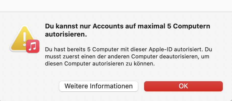 Hallo, ich wollte gerade auf meinem neuen MacBook Pro 14' eine Playlist in iTunes abspielen. Das klappte nicht und ich bekam die Meldung, dass mein Computer nicht autorisiert sei, (s.u. Screenshot). Ich habe in den Accounteinstellungen die nicht mehr gültigen Einträge von iPhone6 und altem iPad gelöscht, so dass nur noch zwei Geräte übrig sind (s.u. Screenshot), dann unter Autorisierungen "Diesen Computer autorisieren..." geklickt, doch es kommt weiterhin die Meldung, ich könne auf maximal 5 Computern autorisieren, s.u. Screenshot. Kann mir jemand sagen, was fehlt und wie die Autorisierung gelingt? Herzlichen Dank!