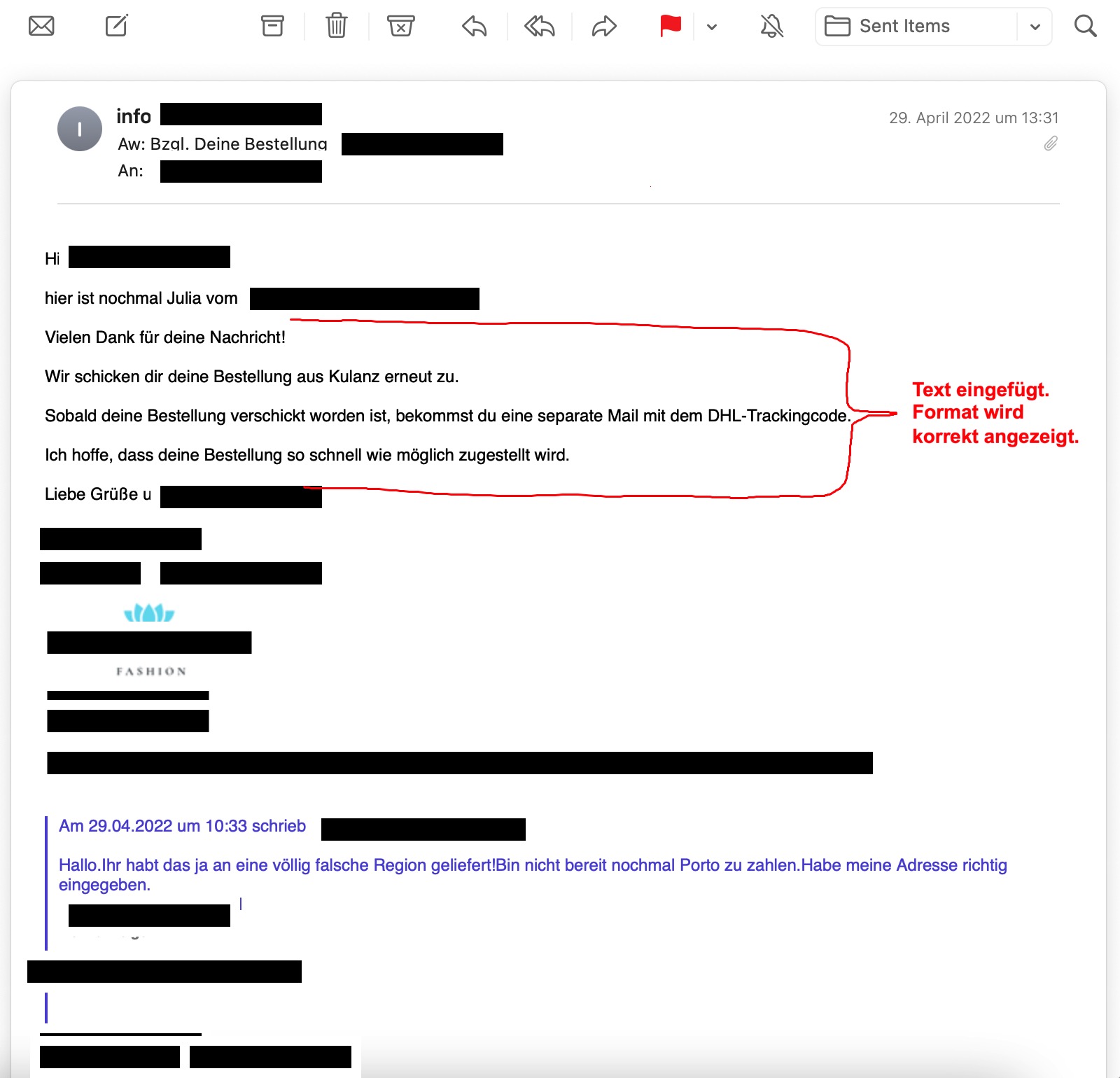 In Mails hab ich eine Standart Einleitung und eine Grußfloskel in der Signatur eingerichtet. Dazwischen schreibe ich immer einen Text rein oder kopiere einen anderen Text rein (aus Excel). Wenn ich in den gesendeten Nachrichten (Mac) die Mail ansehe, sieht auch alles einheitlich aus. Wenn ich die gleiche Mail auf dem Handy (iPhone) ansehe, dann stimmt die Schriftgröße nicht. Woran liegt das? Ich habe mal zwei Screenshots hinzugefügt. Wie kann ich das Problem lösen?