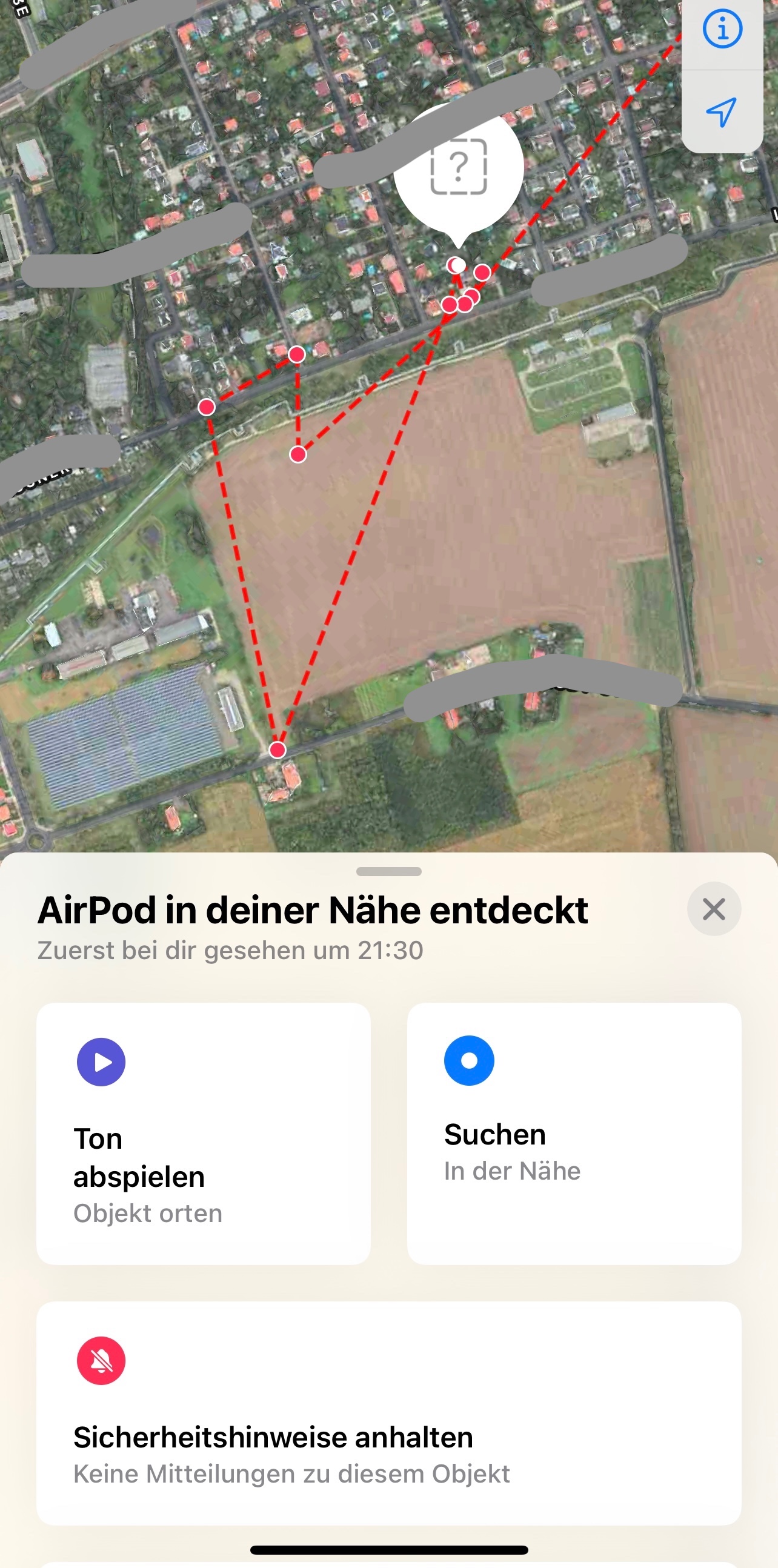 Ich habe eine Meldung bekommen das sich ein AirPod mit mir befindet der nicht mit gehört ich habe meine Sachen durchsucht nichts gefunden ich weiß nichts davon und nun hat die Person meinen genauen Standort das erste mal wurde der AirPod bei mir 21:30 gehen da war ich tanken und genau von dort aus bis nachhause und seit dem soll der AirPod auch noch dort sein