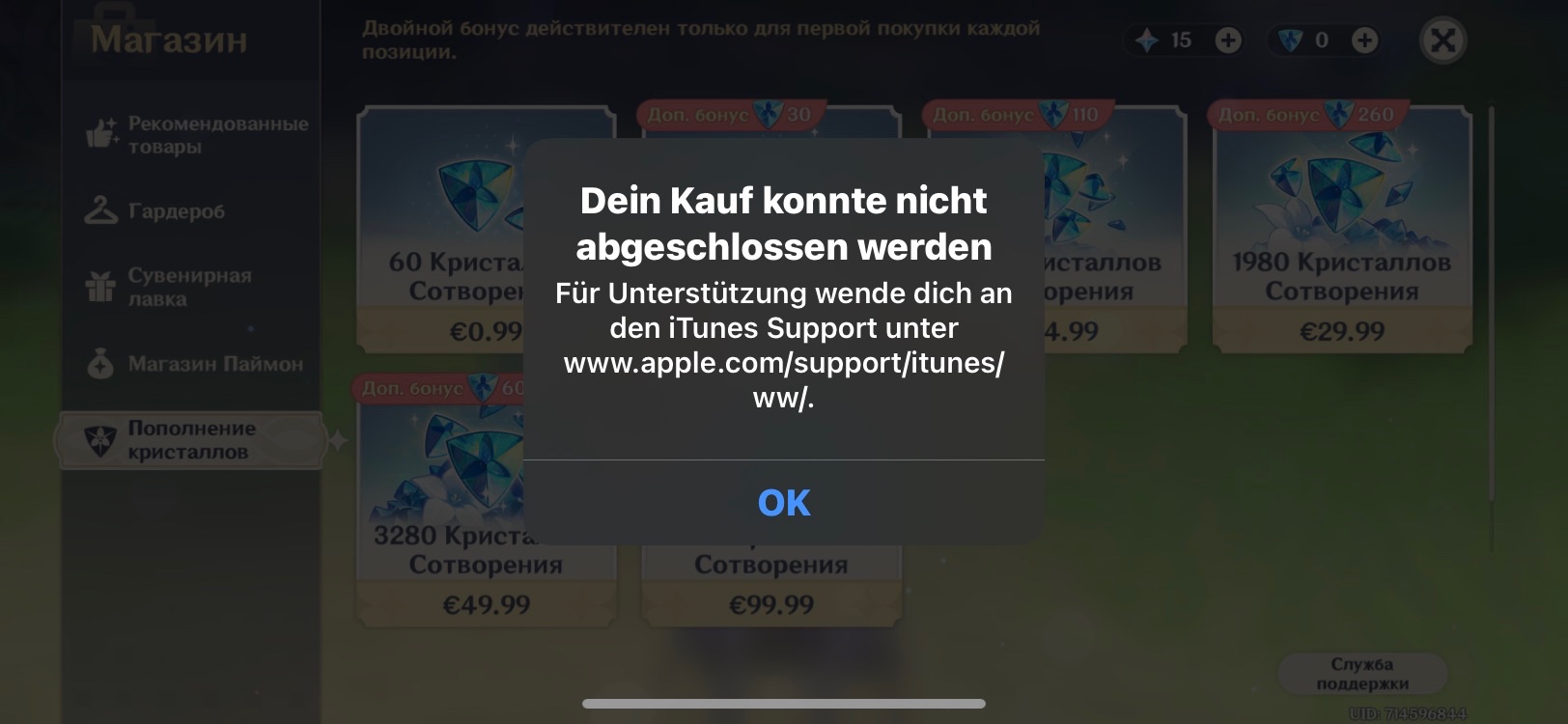 Hallo. Bei mir erscheint in Inn-App Käufen ein Fehler: „Dein Kauf konnte nicht abgeschlossen werden | Für Unterstützung Wende dich an iTunes..“. Ich habe auch 3 mal hier Hilfe gesucht aber leider wurde es nichts, also Zahlungsmethoden geändert, neugestartet, liefer-und Rechnungsadresse ausgefüllt usw… Könnten sie mir da irgendwie helfen oder müssen sie das weitergeben?