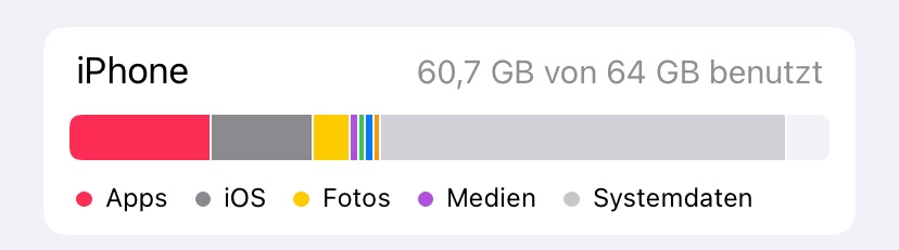 Und wieder lief das doofe Ding voll und der tolle Trick von oben hat diesmal nicht funktioniert. Also mit knirschenden Zähnen das XR wieder neu aufgesetzt. Danach über 45 GB frei. Schnell iOS 15.5 drübergebügelt und jetzt hoffen, dass es das nun endlich gewesen ist. 15.5 soll ja wenigstens den anderen Bug heilen mit dem falsch angezeigten freien Speicher (den ich ne hatte) und ich hoffe in meiner Naivität einfach mal, dass diese beiden Käfer verwandt sind miteinander.