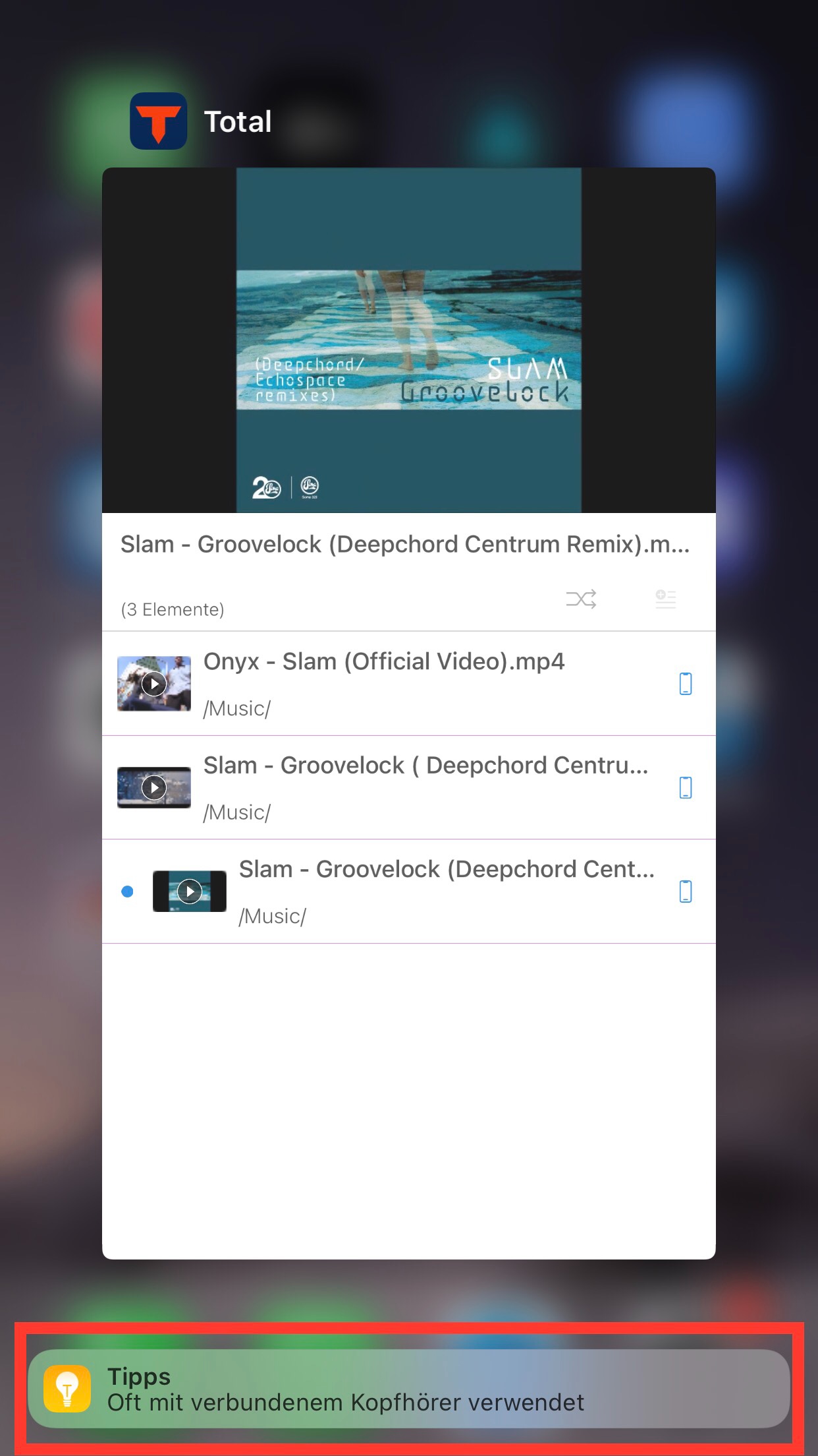Wenn ich Abspielprogramme benutze und den Homebutton doppelklicke erscheint dieser Button am unteren Ende. Wenn ich ausversehen draufklicke öffnet sich das entpsrechende Programm. Manchmal wird VLC, Musik oder Tipps vorgeschlagen.