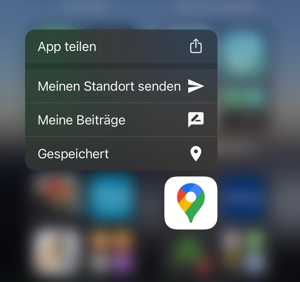 In diesem Fall handelt es sich um alle möglichen Apps wie Google Maps und Spiele und so weiter. Der Menüpunkt App löschen wird gar nicht erst angezeigt sondern nur App teilen bzw Home Bildschirm bearbeiten.