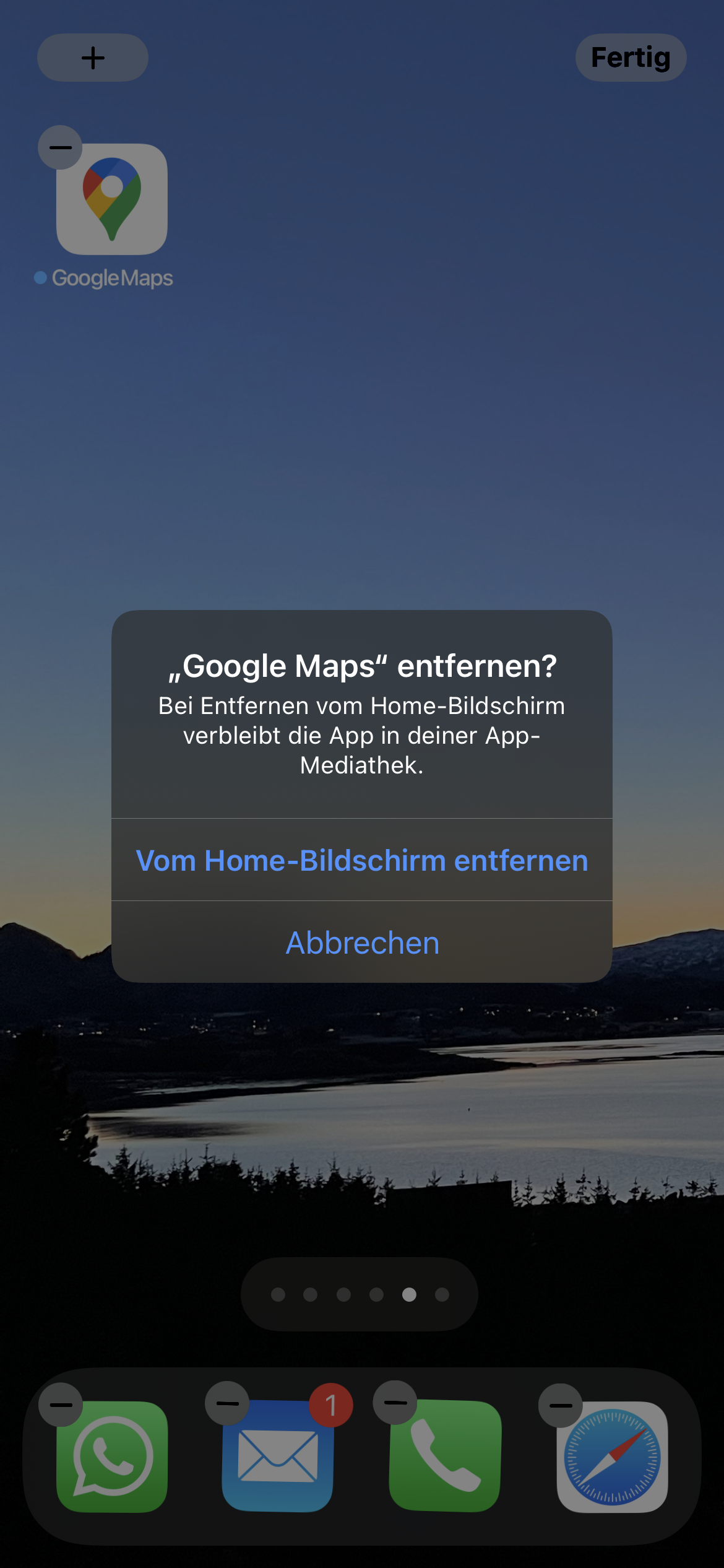 Du gehst mit dem Finger auf eine freie Stelle des Displays - alle Apps fangen an zu „wackeln“. Und oben links haben die ein „Minus-Zeichen“ - da drauf gehen und dann macht das Menü auf aus dem Du wählen kannst. bei Googel Maps auch App löschen oder nur vom Bildschirm entfernen.
