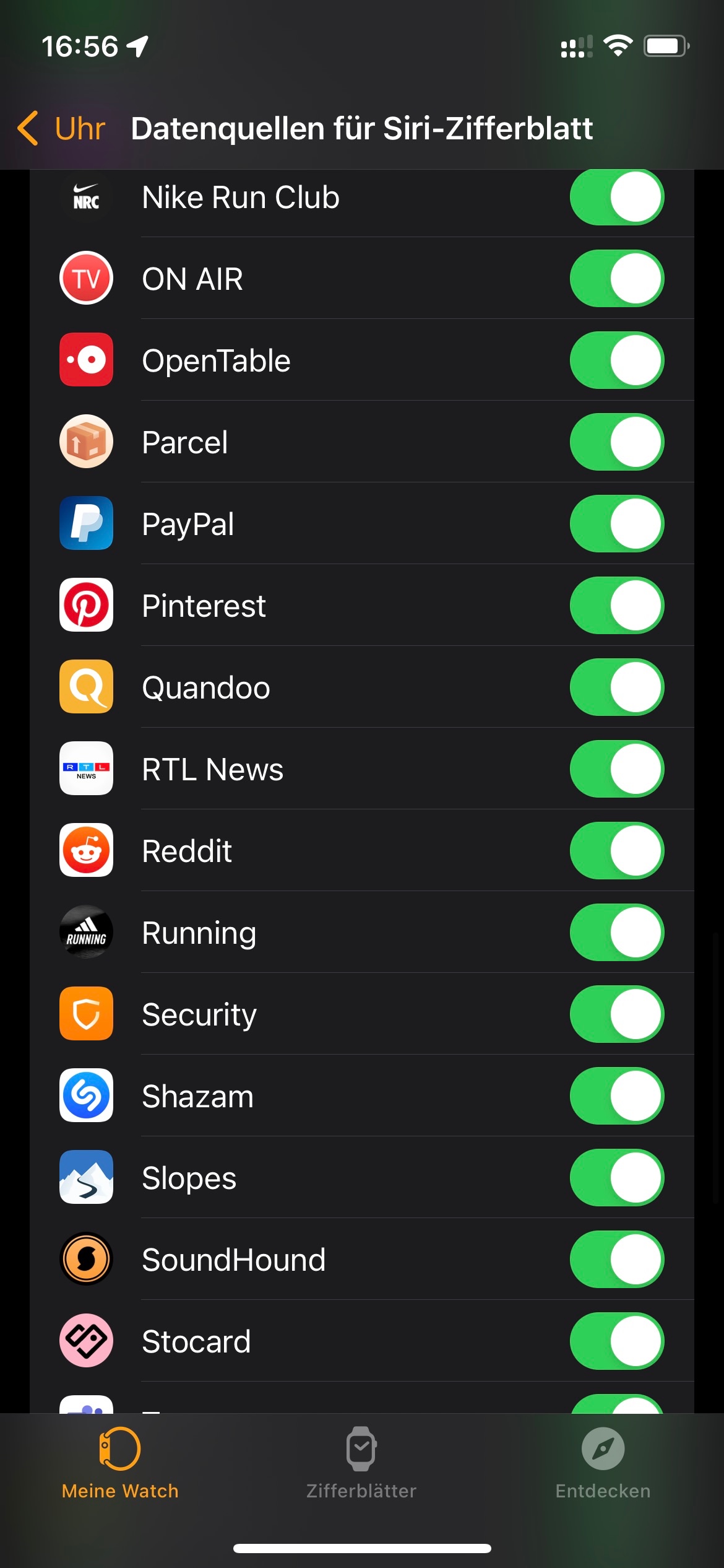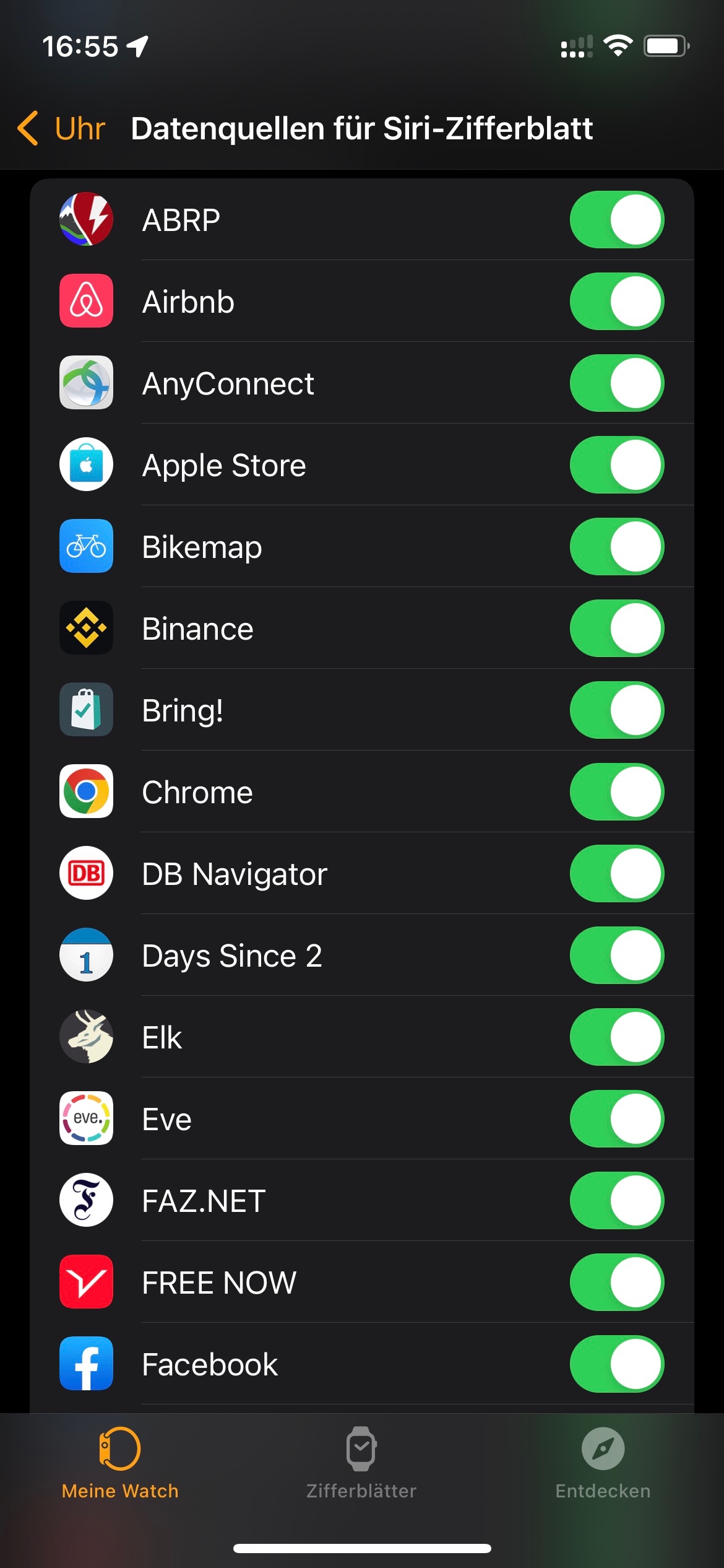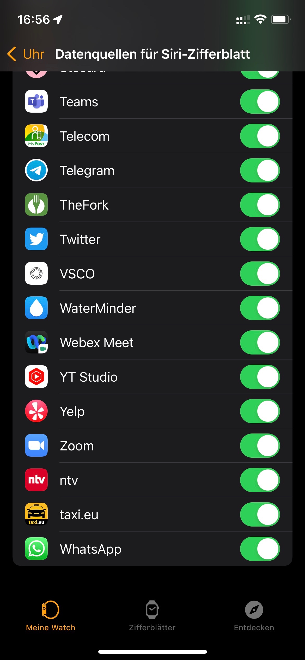 Nun habe ich aber das Problem, dass außer WaterMinder keine Drittanbieterapps als Kacheln angezeigt werden. Manche werden von einem Tag auf den anderen nicht mal mehr in der iPhone App unter Uhr>Datenquellen für Siri Zifferblatt angezeigt. Die typischen Sachen wie Neustarten, Entkoppeln, Apps neu installieren und so habe ich schon gemacht.