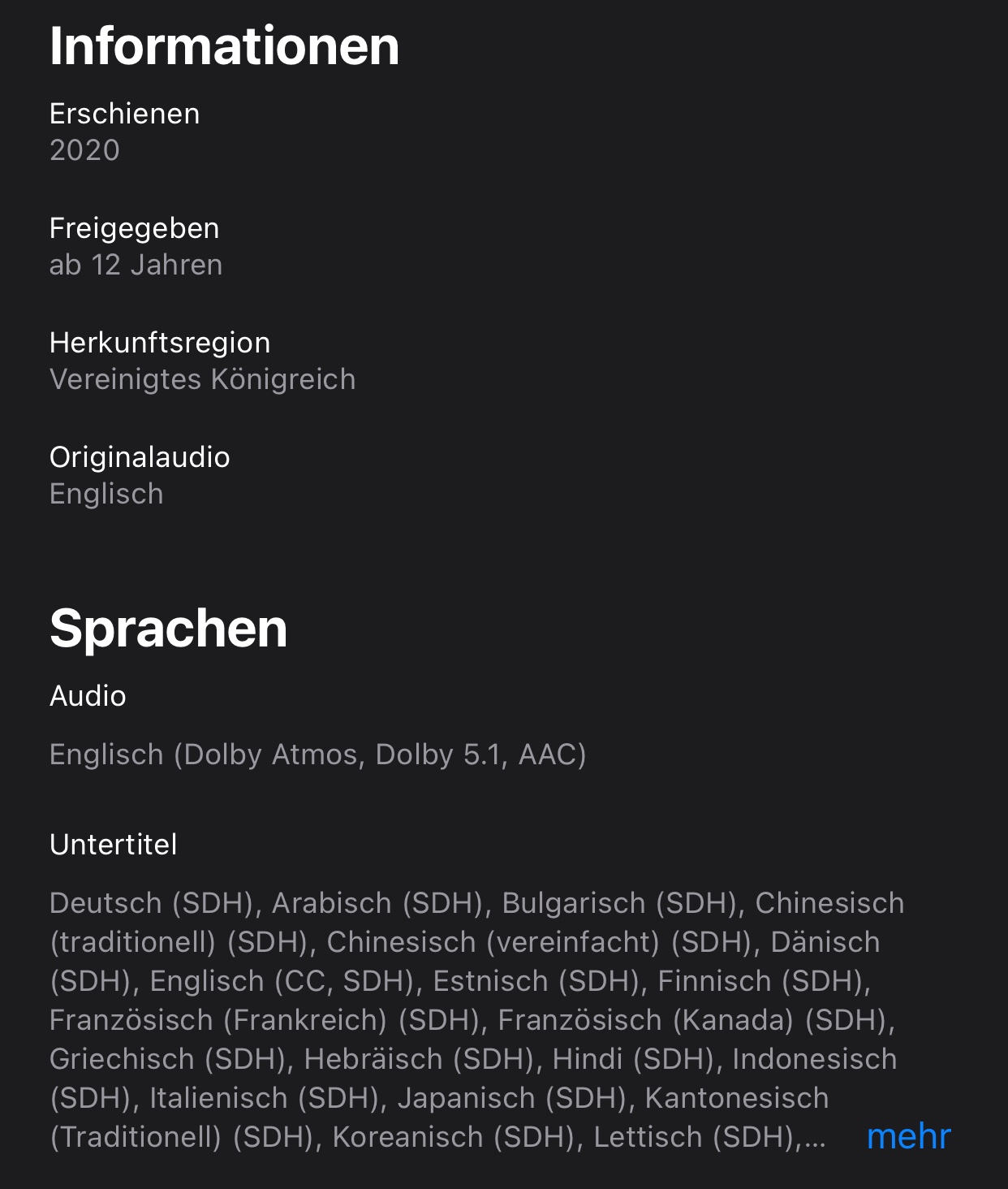 Sind die anderen Sprachen entfernt worden? Ich wollte heute etwas bei Apple TV schauen und nirgends finde ich die deutsche Sprache, geschweige denn was anderes als Englisch. Hab’s jetzt auf mehreren Geräten probiert, überall nur Englisch mit Untertiteln.