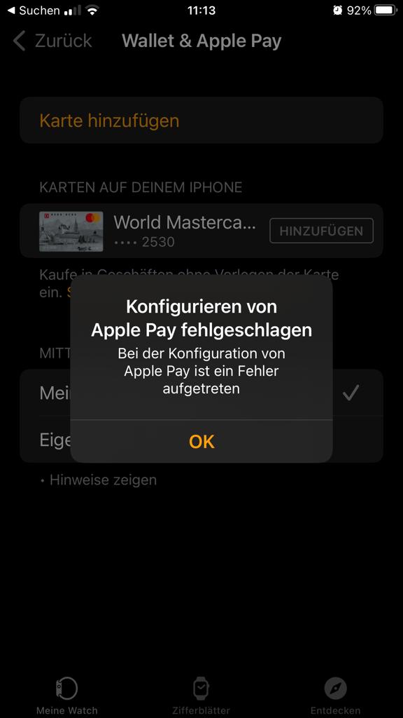 Kreditkarte lässt sich nach Apple Watch Reparatur nichtmehr zum Wallet hinzufügen