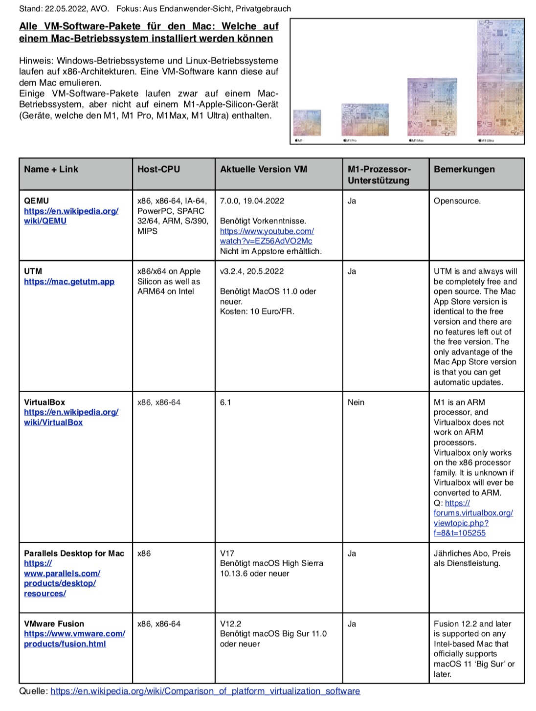Die Liste stammt von https://en.wikipedia.org/wiki/Comparison_of_platform_virtualization_software, ist aber bei weitem auch nicht vollständig, da UTM dort noch nicht drauf war.