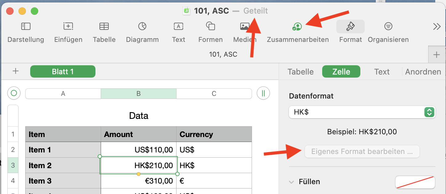 Mir ist aufgefallen das ich keine Benutzerformate für Daten erzeugen kann / ändern kann sobald ich eine Numbers Datei / Ordner mit anderen teile.