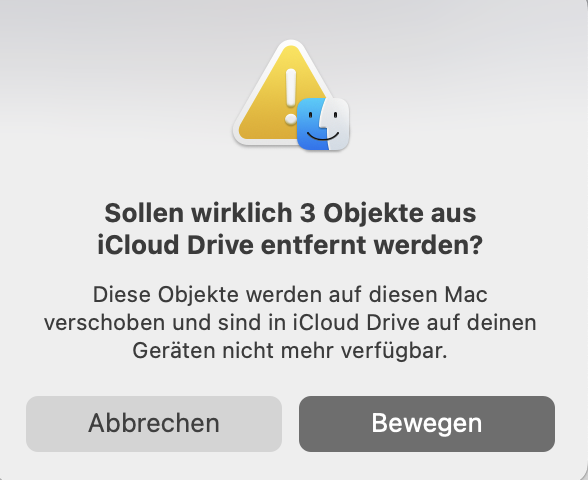 Die Warnung "Möchtest du ... Dateien von iCloud Drive verschieben", erscheint immer dann, wenn du Dateien auf iCloud Drive auswählst, um sie in einen lokalen Ordner zu verschieben. Das ist eine Erinnerung, dass du anschliessend auf diese Dateien nicht mehr von deinen anderen Geräten aus zugreifen kannst.
