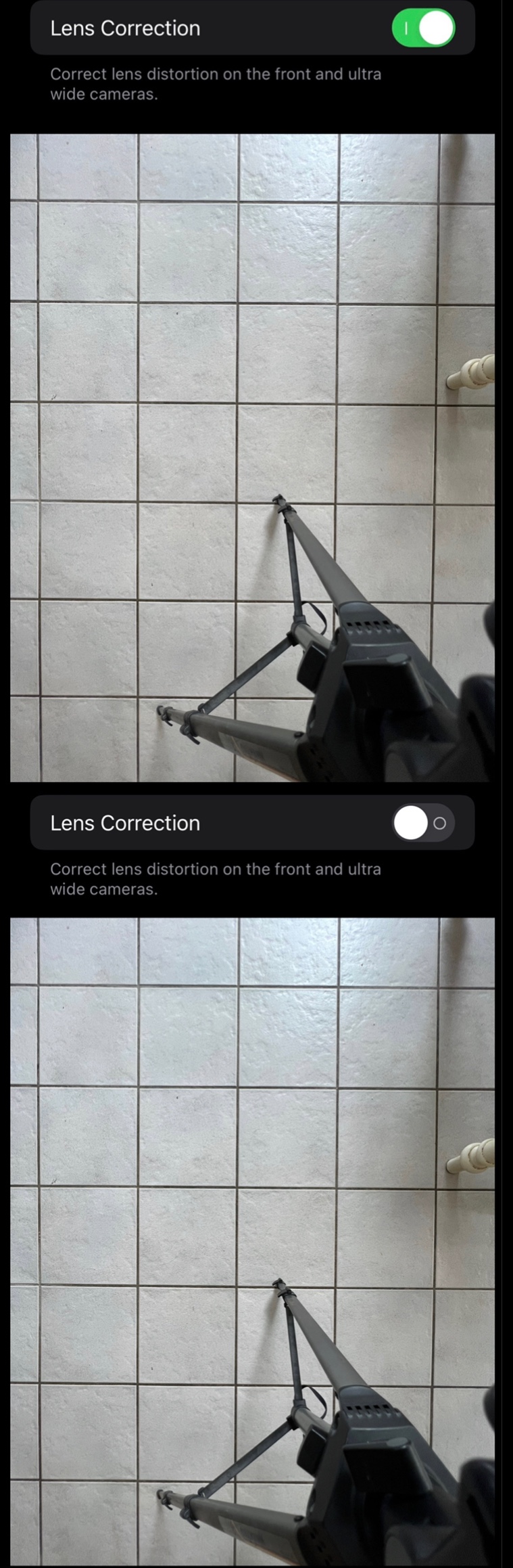 Allerdings scheint der Schalter nicht zu funktionieren. Er hat absolut keine Wirkung! Mit keiner der drei Linsen. ... beweis Fotos für weit Winkel linse (0.5) sind angehängt. ... Das Bild ist aufgenommen mit Linsenkorrektur ein und aus. Exakt das gleiche Bild, die Verzeichnungskorrektur wurde nicht deaktiviert. Alle Linien verlaufen noch gerade. Ohne Verzeichnungskorrektur wären die Linien im Randbereich gekrümmt.