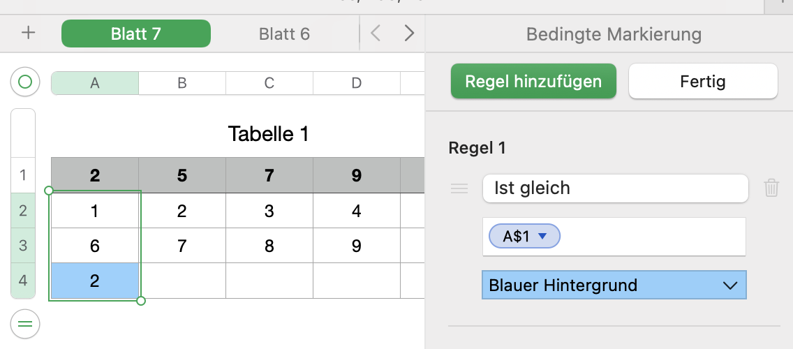 welche Formel muss ich in Numbers erstellen damit folgendes passiert: wenn ich in der oberen Spalte zahlen eingebe dann möchte ich das in der unteren farblich die Markiert werden.