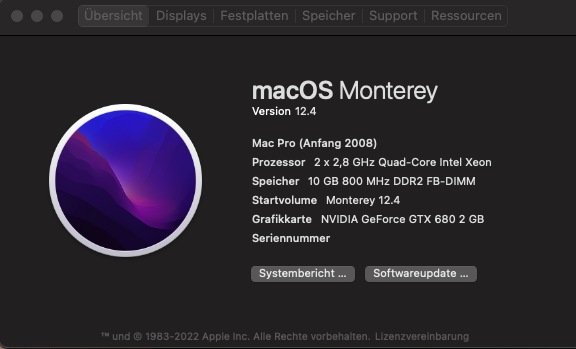 Es bliebe dir allerdings noch die Option, ein gepatchtes MacOS Monterey 12.4 zu installieren, ein MacOS also, das zwar seitens Apple als nicht mehr kompatibel mit dem Typ oder dem Modelljahr deines Mac deklariert wird, das aber von fachkundigen Usern für diese "nicht-kompatiblen" Rechner lauffähig gestaltet wurde.