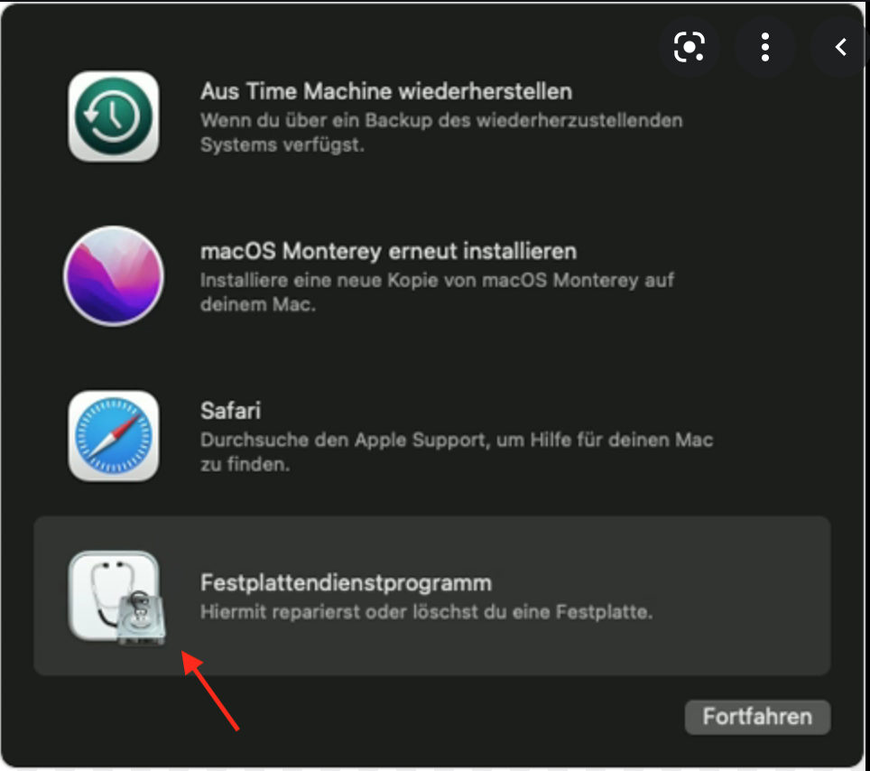 Exit --> oder --> Neustart wieder mit gedrückten Tasten "cmd R" (oder Vorgehen wie bei M1 Mac) in die Internet-Recovery – lass die Tasten erst los, wenn das Apple Logo/Ladebalken (oder die Meldung beim M1, "Startoptionen werden geladen") erscheint; dann wieder dieser Bildschirm