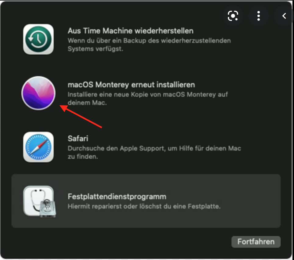 Klick auf "macOS Monterey erneut installieren" (ist für Big Sur das gleiche Vorgehen) --> Weiter --> Lizenzbedingungen akzeptieren --> Weiter