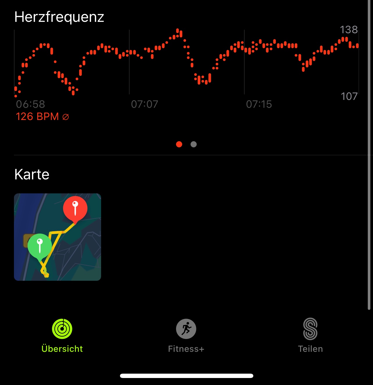 mir ist kürzlich aufgefallen, dass bei meinem Outdoor-Lauftraining nicht mehr das Wetter aufgezeichnet wird (Screenshot zeigt neben der Karte den Teil, den ich meine). Ich kann leider nicht genau sagen, seit wann dies nicht mehr ist, da ich mehrere Wochen mit dem Training aussetzen musste. Aufgefallen ist es mir nur, da ich neulich nachträglich die Höhe der Luftfeuchte erfahren wollte. Zuletzt zeichnete die Uhr (bzw. das verbundene iPhone) diese Daten bei meinem Training am 12.03.2022 auf.