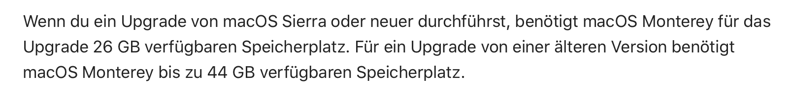 Ferner sollte ausreichend Speicherplatz auf der Macintosh HDD/Fusion Drive vorhanden sein – in Abhängigkeit vom zur Zeit installierten MacOS sind für die reibungslose Installation von MacOS Monterey bis zu 44 GB freier Speicherplatz nötig.