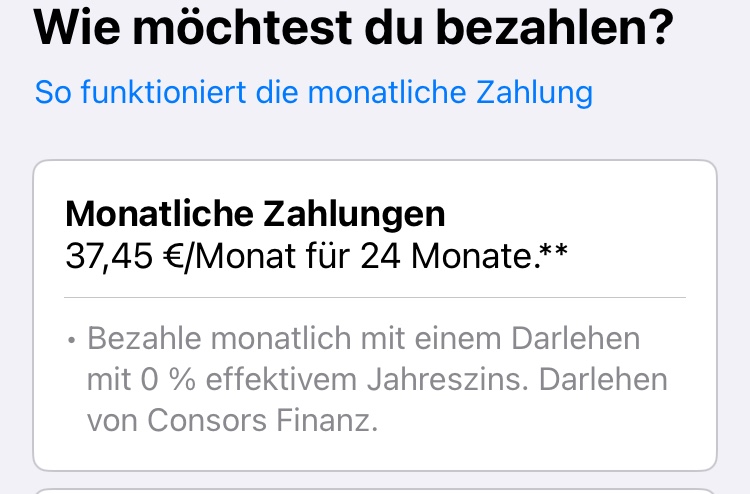 Habe nun sowohl bei Apple als auch bei Consors Finanz mehrmals angerufen. Jeder schiebt es auf den jeweilig anderen ab. Fakt ist: Eine Online-Finanzierung ist momentan aufgrund technischer Probleme, die noch bis in den Juli hineinreichen werden, nicht möglich. Sehr schade!