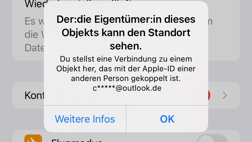 Ich habe gestern eine Nachricht bekommen von einem Freund und hab zu schnell draufgeklickt. War so ein Link auf ne "Gewinnspiel"-Seite. Habe es natürlich sofort wieder geschlossen.Hab gleich zur Sicherheit trotzdem mein AppleID Passwort geändert. Nach ein paar Stunden kam plötzlich eine Message, dass ich von einer zensierten Email (********@outlook.com) geortet werde und links oben sprang das GPS Symbol an. Ich benutze kein Outlook. Es war ein Iphone Pop up mit "Mehr erfahren" und ich kam auf die offizielle Support Seite von Apple und der Erklärung von AppleTags. Hab gleich mein Handy zurückgesetzt auf ein Backup bevor ich auf die Nachricht geklickt habe. Habe auch vorher mein Iphone gründlich durchsucht, ob sich wer eingeschlichen hat. Bei "Wo ist" waren nur meine Geräte und keine Tags gemeldet. Bin jetzt gleich bei Datenschutz unter Standort rein und hab mal alles deaktiviert was möglich ist. Trotzdem wird mir das GPS Symbol angezeigt, obwohl ich jede Standortabfrage auf "Nie" oder ausgeschaltet habe.