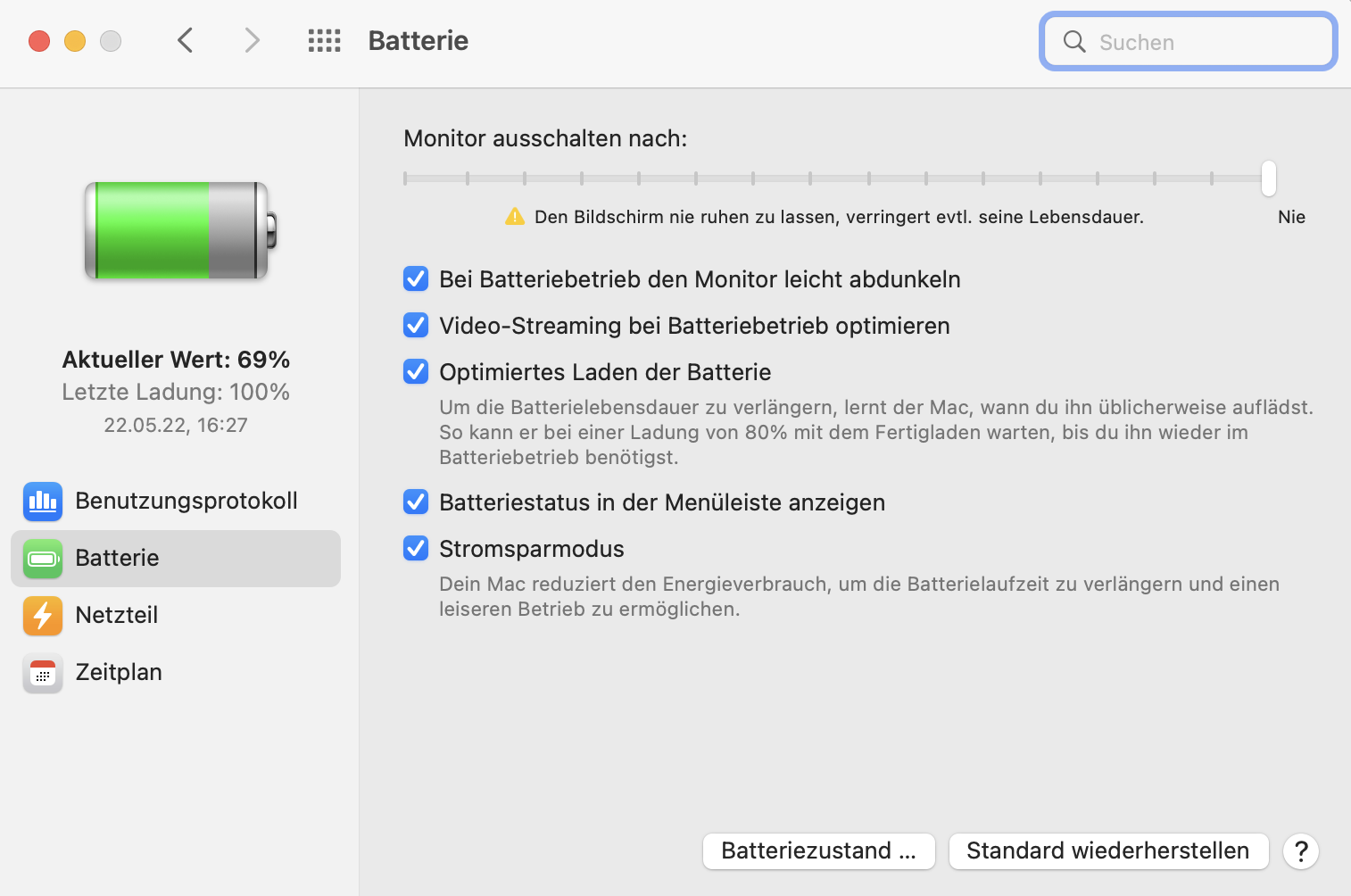 In MacOS 12.3.1 habe ich bemerkt, dass viele Funktionen vom iPhone rückimportiert wurden, z.B. die Stromsparfunktion hier: