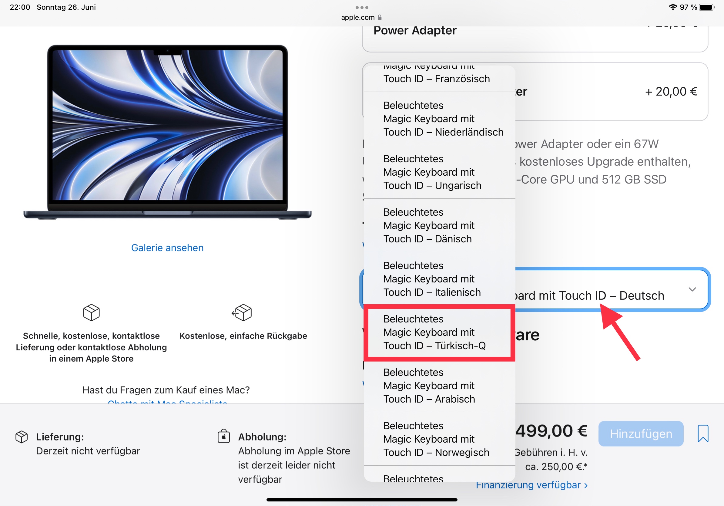 Ich möchte ein MacBook Air M2 2022 in Deutschland kaufen aber mit den türkischen Tastatur. Deswegen habe ich mich gefragt, ob ich es in Apple Store bekommen kann oder ist es nur beim Online-Kauf erhältlich?