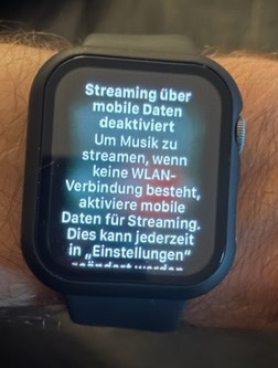 Nur beim Versuch über die mobile Datenverbindung Musik zu streamen (via der Apple App „Musik“) erhalte ich eine Fehlermeldung (siehe Photo). Das Streaming müsste aktiviert werden.