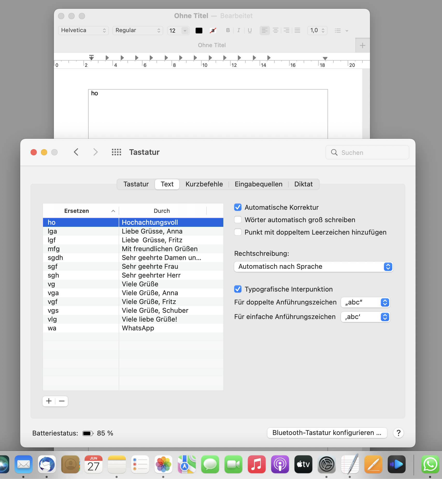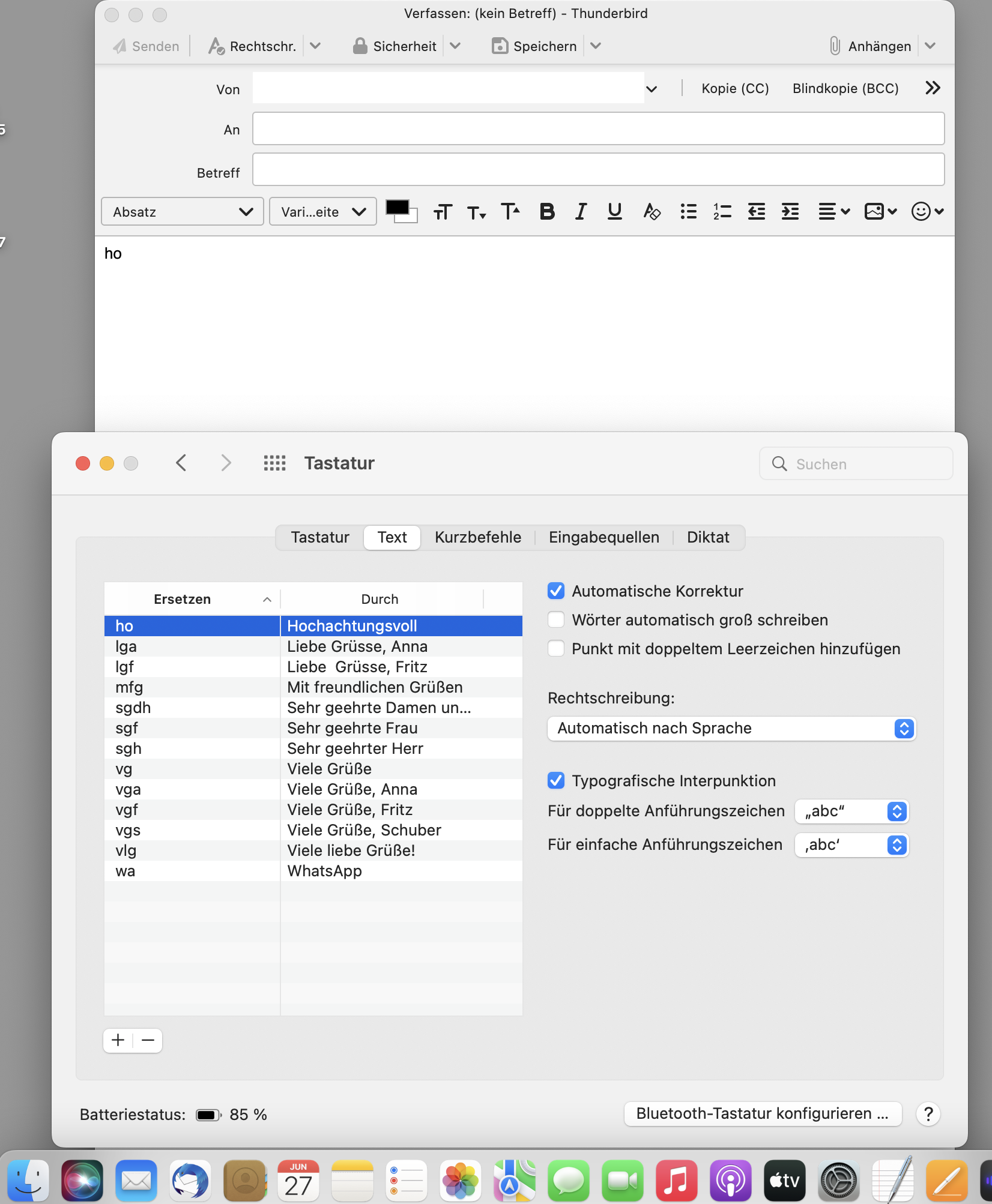 Komme zurück auf die bis gestern geführte Diskussion zu obigem Thema. Wie aus dem Anhang ersichtlich, funktioniert Textersetzung bei TexEdit offnebar nicht. Wollte ho=Hochachtungsvoll am 27.6.22 ersetzt bekommen, aber es funktionierte nicht, auch nicht auf Thunderbird, wohl aber auf mail. Hat jemand eine andere Erfahrung?
