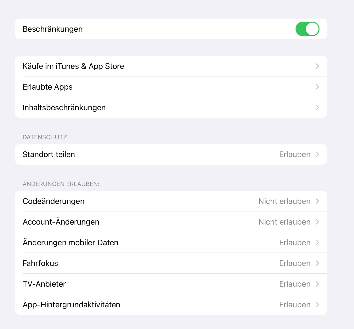 Zu finden beim Organisator unter „Einstellungen - Bildschirmzeit - Name der Person - Beschränkungen“