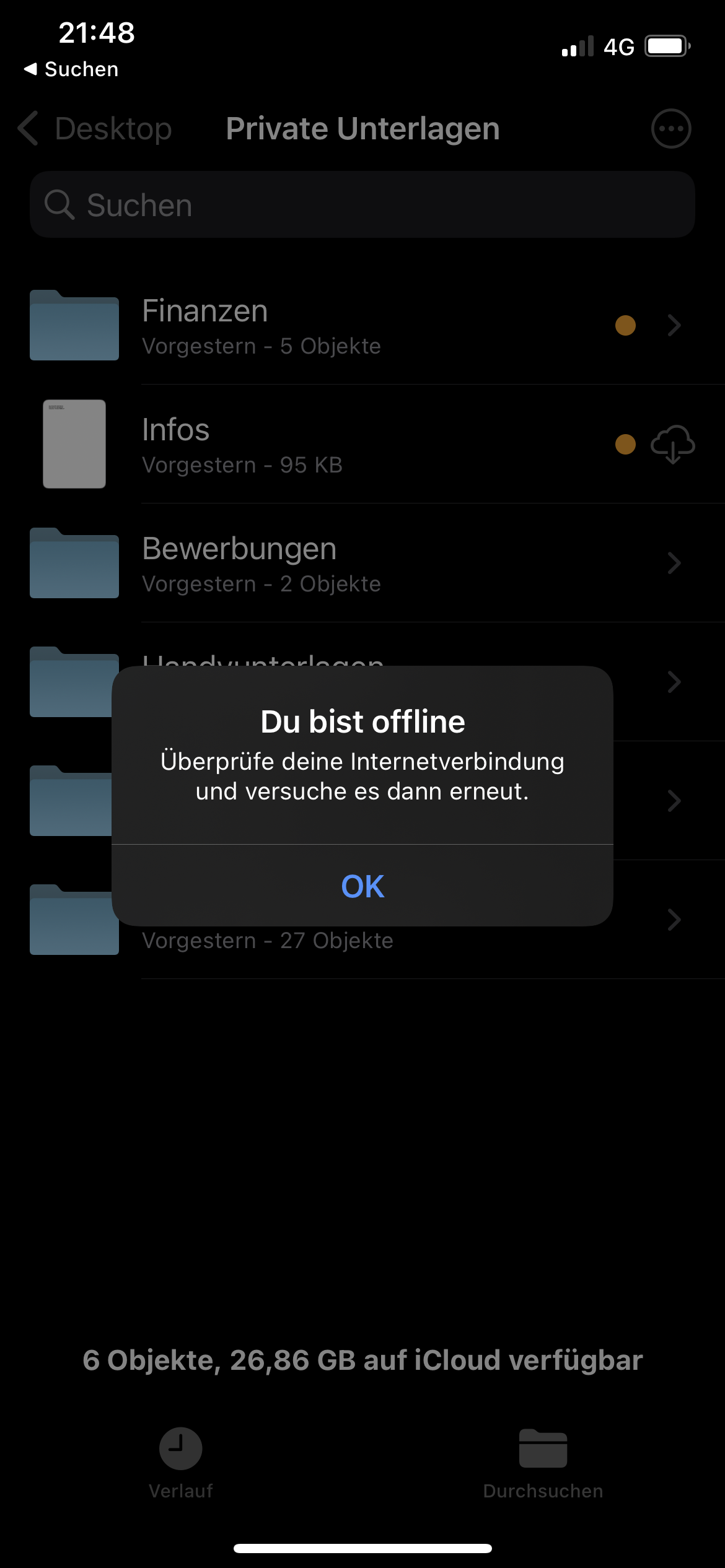 trotz 4G Netz kann ich Dateien aus der Cloud (in diesem Fall von mein Mac-Desktop) nicht vom iPhone aus öffnen. Es kommt eine Fehlermeldung , siehe Anhang . Im WLAN funktioniert es .