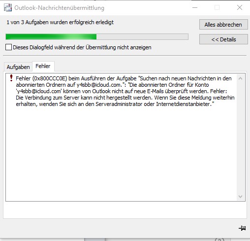 Nachdem ich ein anwendungsspezifischen Kennwort in meinem Apple Account eingerichtet habe und dieses in der App Outlook 2010 in den iCloud- Maileinstellungen unter Kontoeinstellungen eigegeben habe und auch noch die Servereinstellungen verändert habe, funktioniert der Zugang. bemerkenswert ist hier noch zusätzlich, dass Posteingangs- und Postausgangsserver unterschiedliche Verschlüsselungstypen haben wollen. Details siehe Bild:
