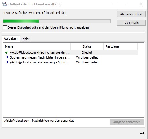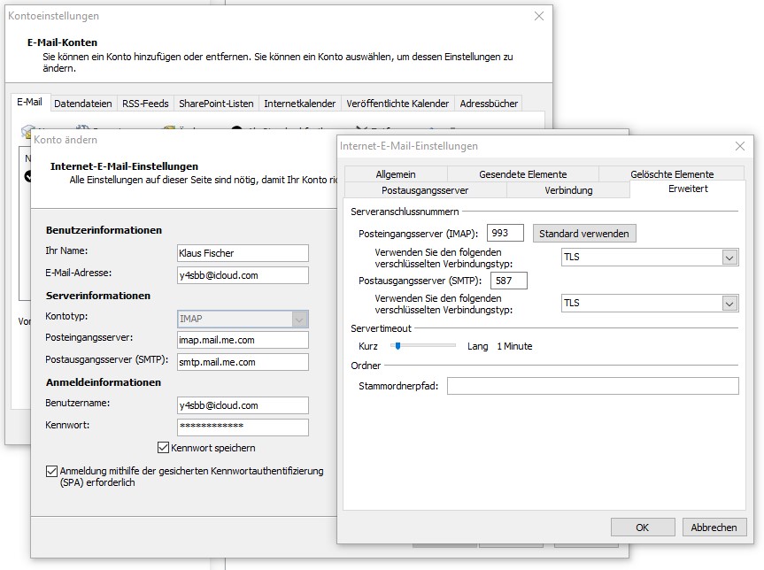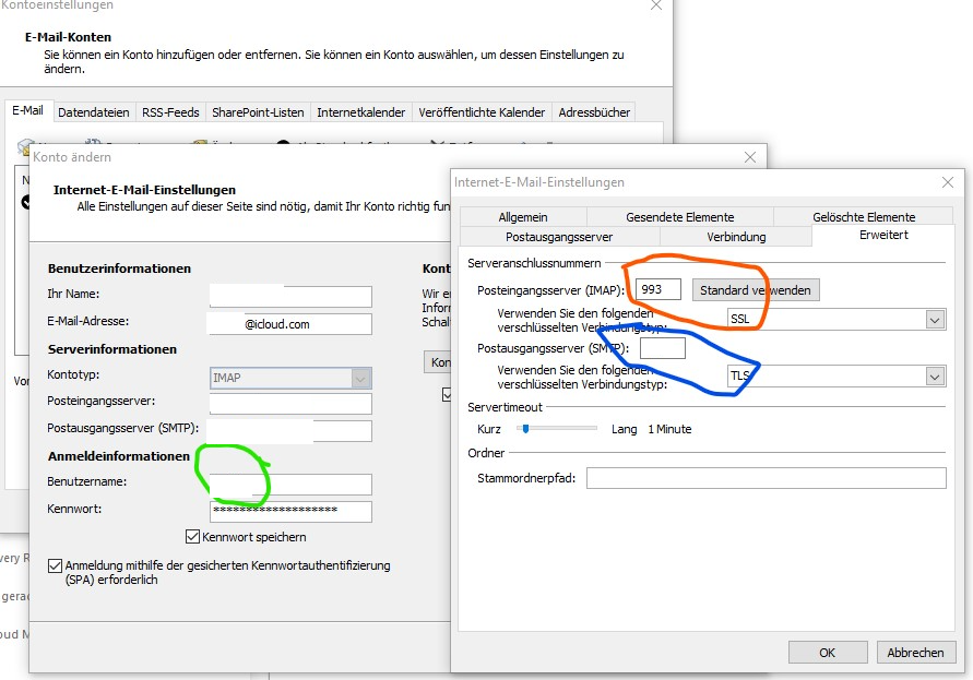 Wichtig ist auch, dass beim Posteingangsserver als Benutzername "nur" der Name der Mail, ohne den Zusatz @icloud.com eingegeben werden darf.